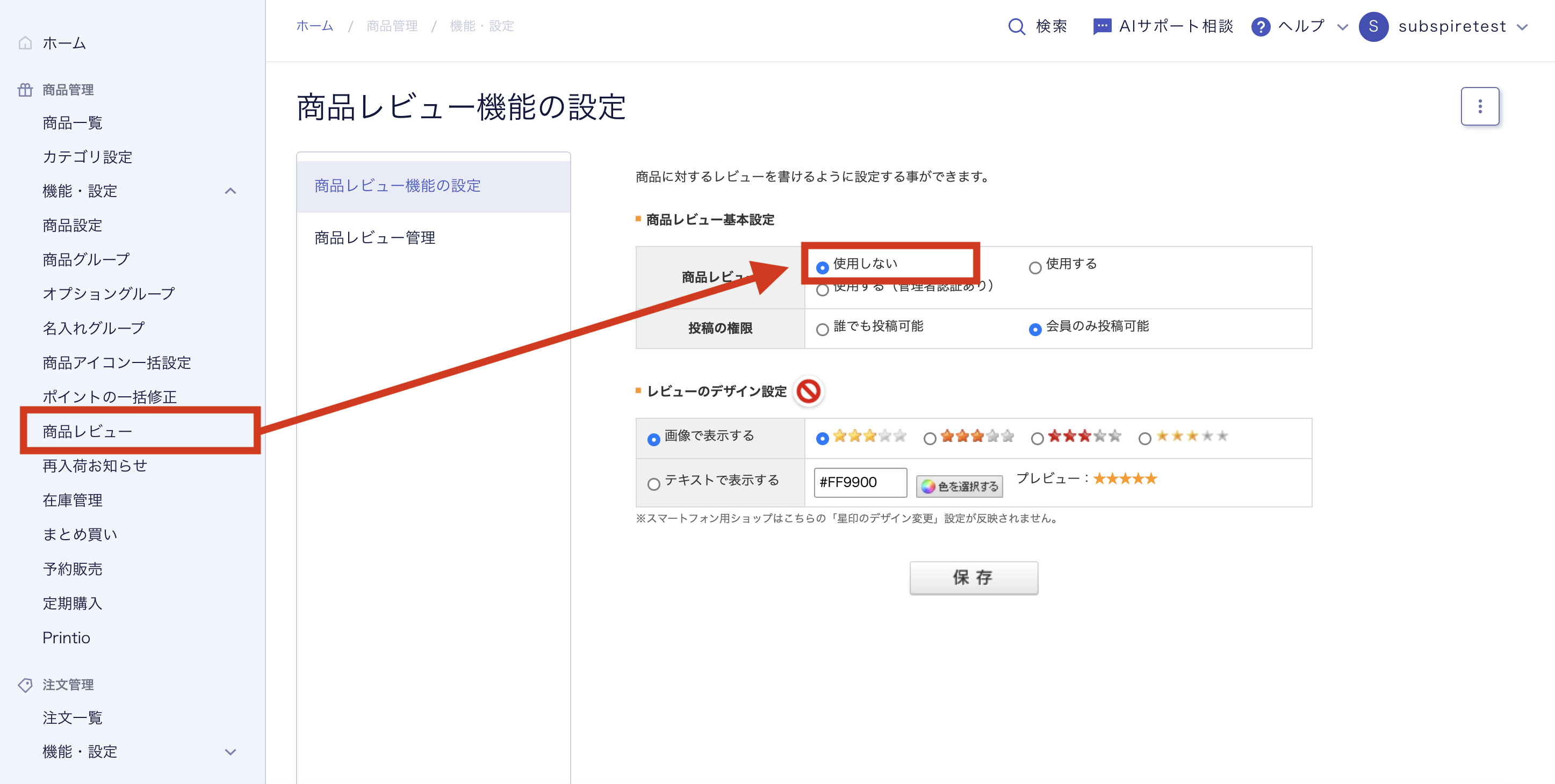 ☝️makeshop管理画面の「商品管理>機能・設定>商品レビュー機能の設定」から無効化することができます。