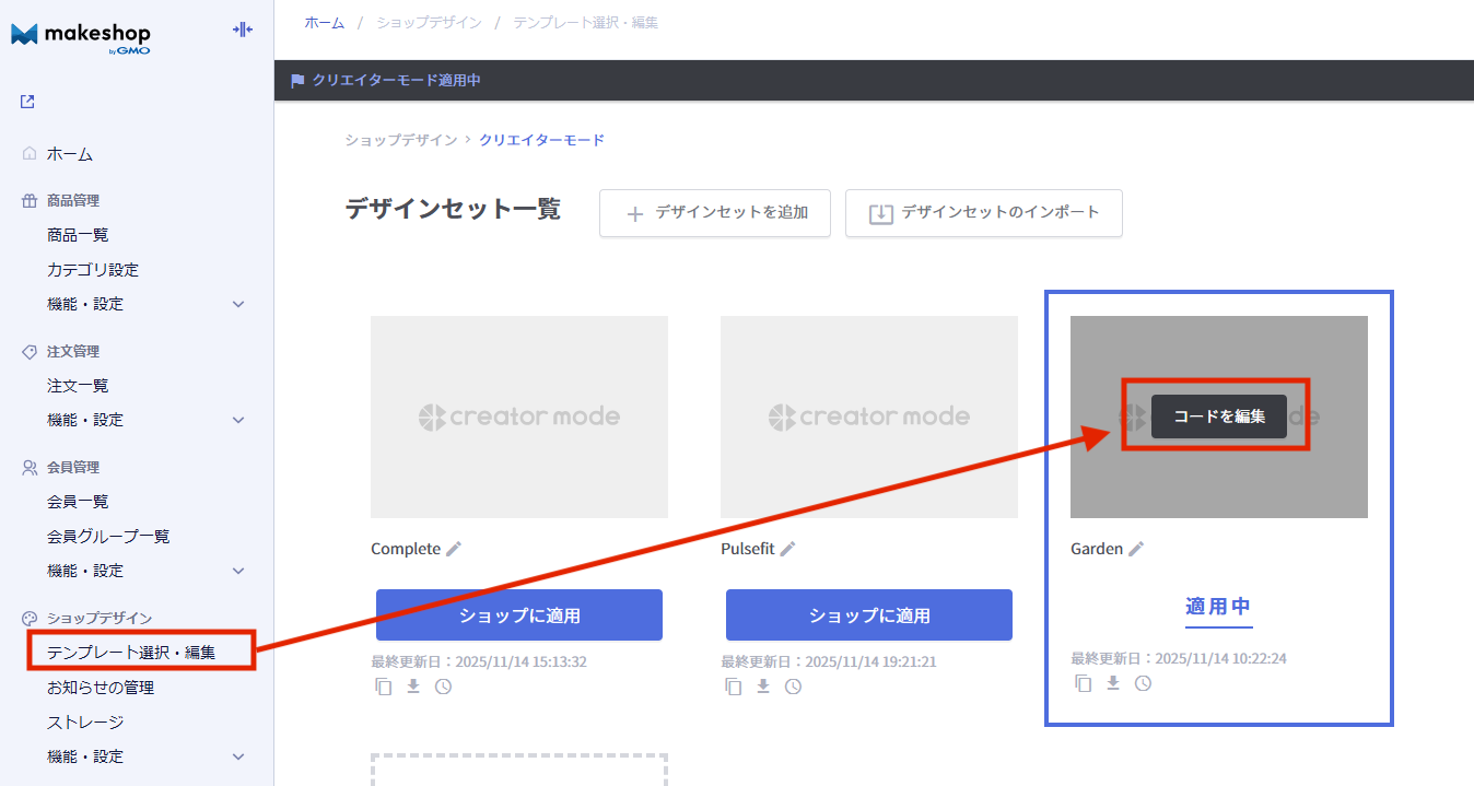 ①makeshop管理画面の「ショップデザイン > テンプレート選択・編集 > デザインセット一覧」より、使用するデザインセットを選び「コードを編集」を押します。