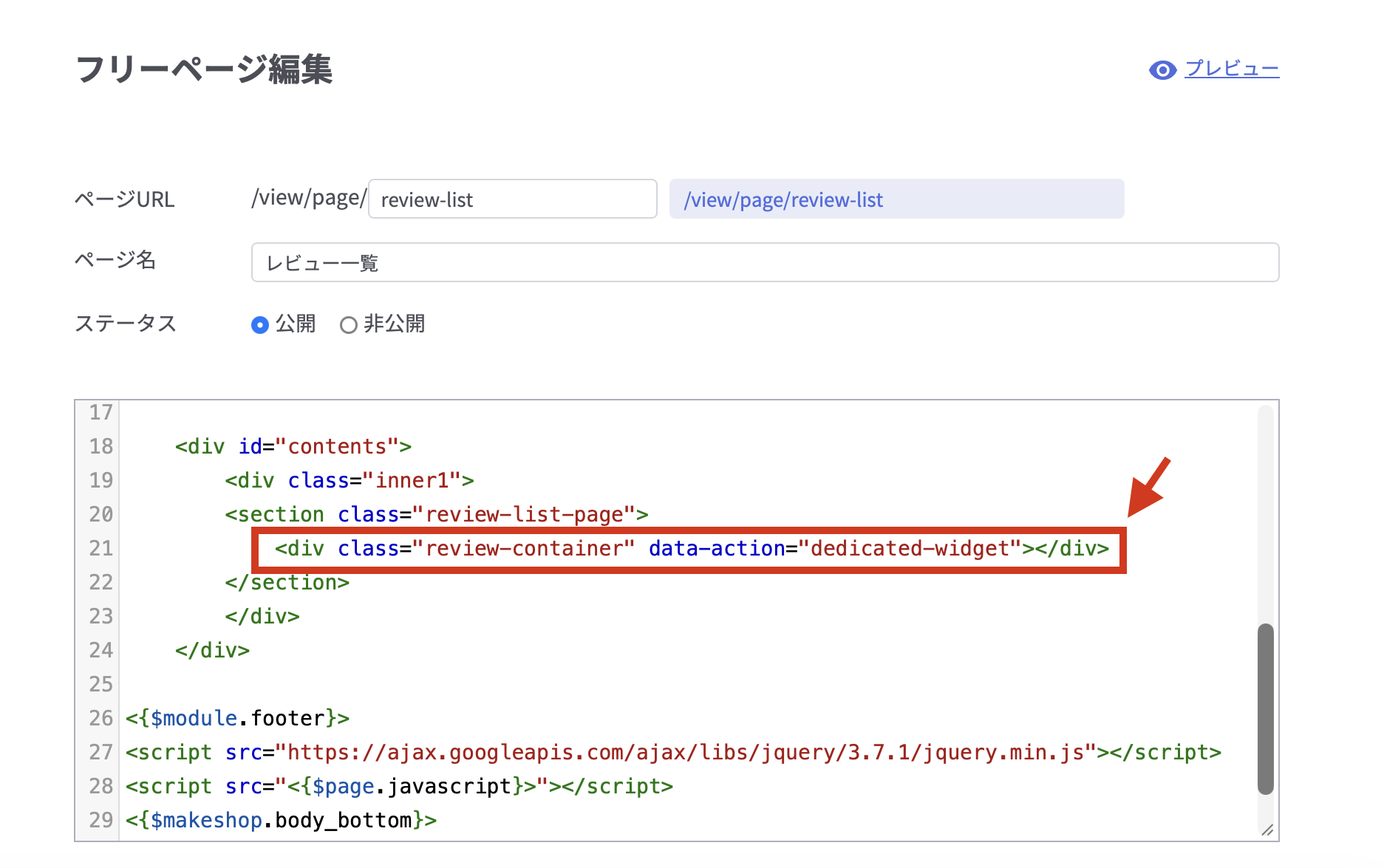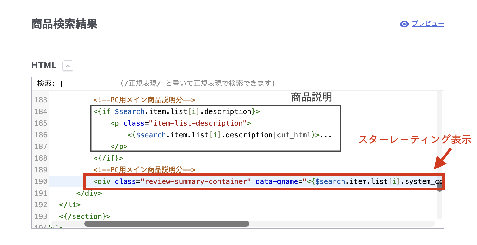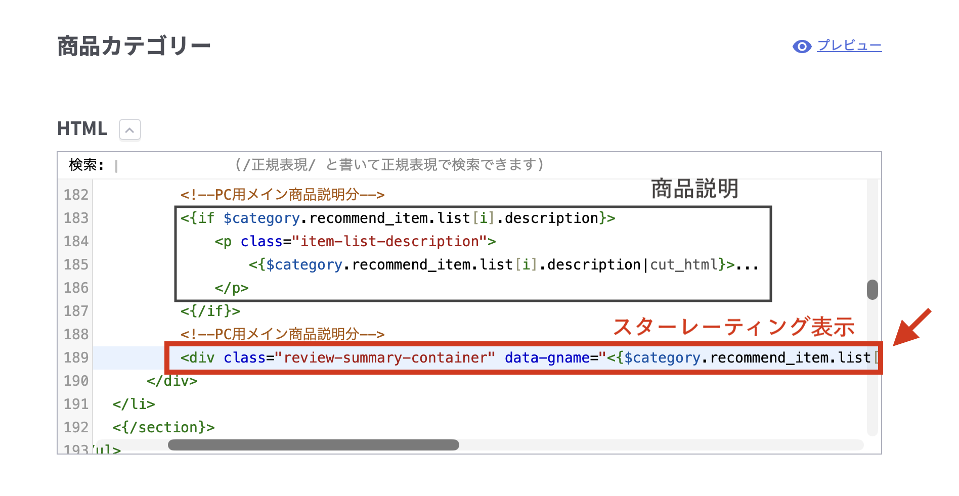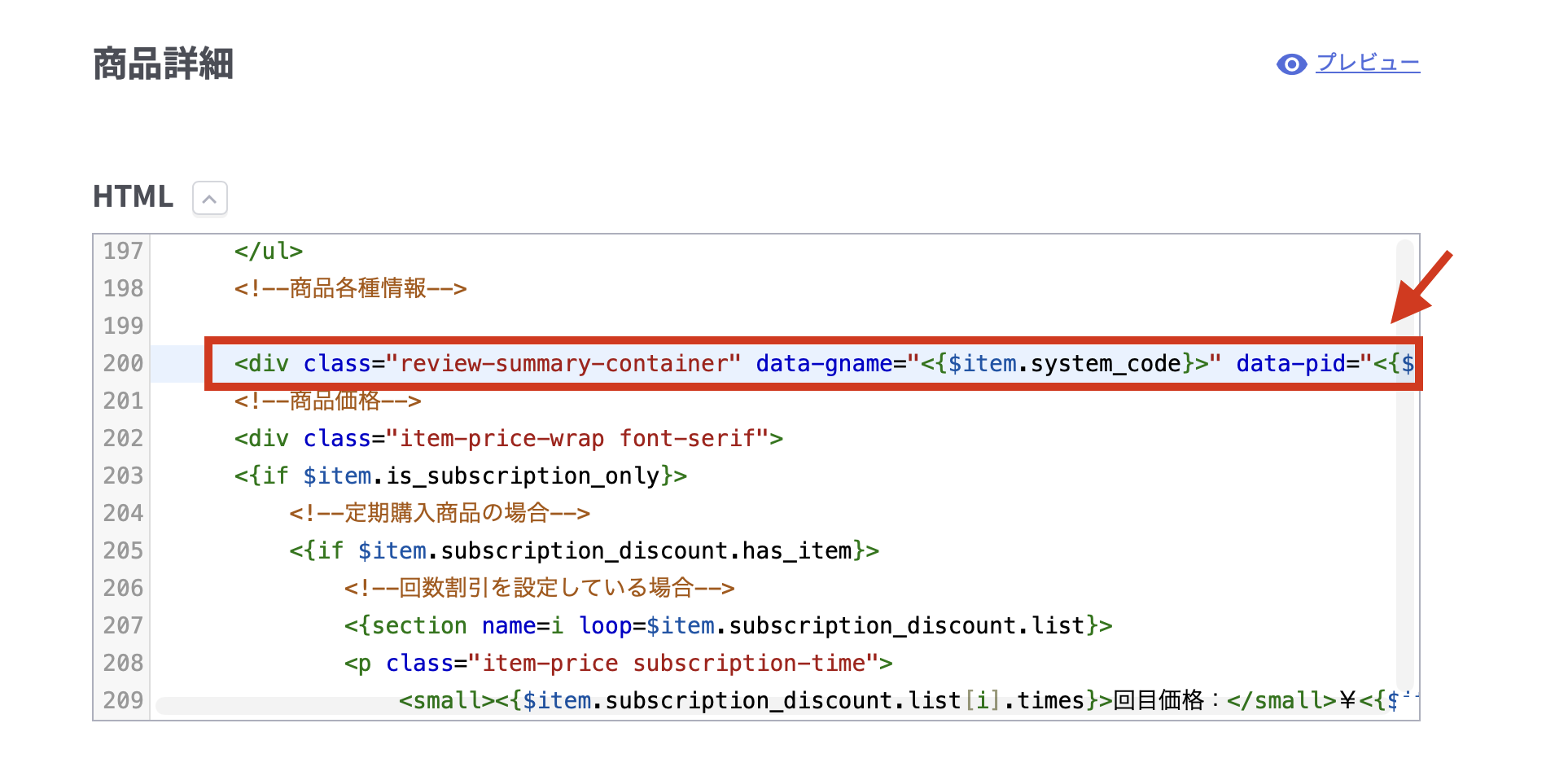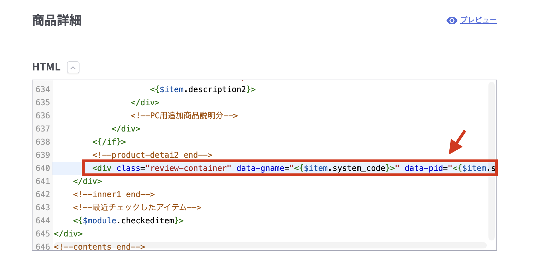 ②HTML欄の <!--product-detai2 end--> の部分に、レビュー一覧を表示するタグを入力し、「保存」を押します。