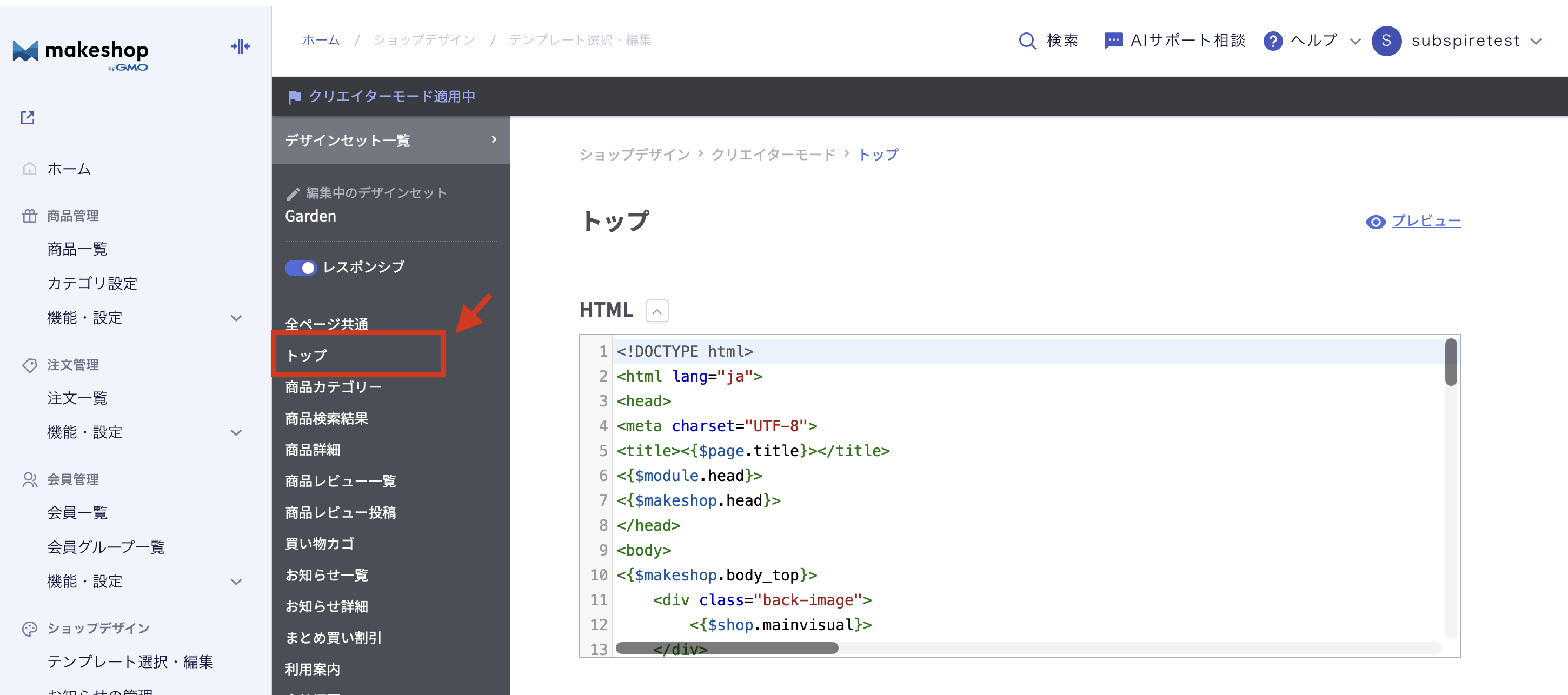 ①makeshop管理画面の「ショップデザイン > テンプレート選択・編集 > コードを編集 > トップ」を開きます。