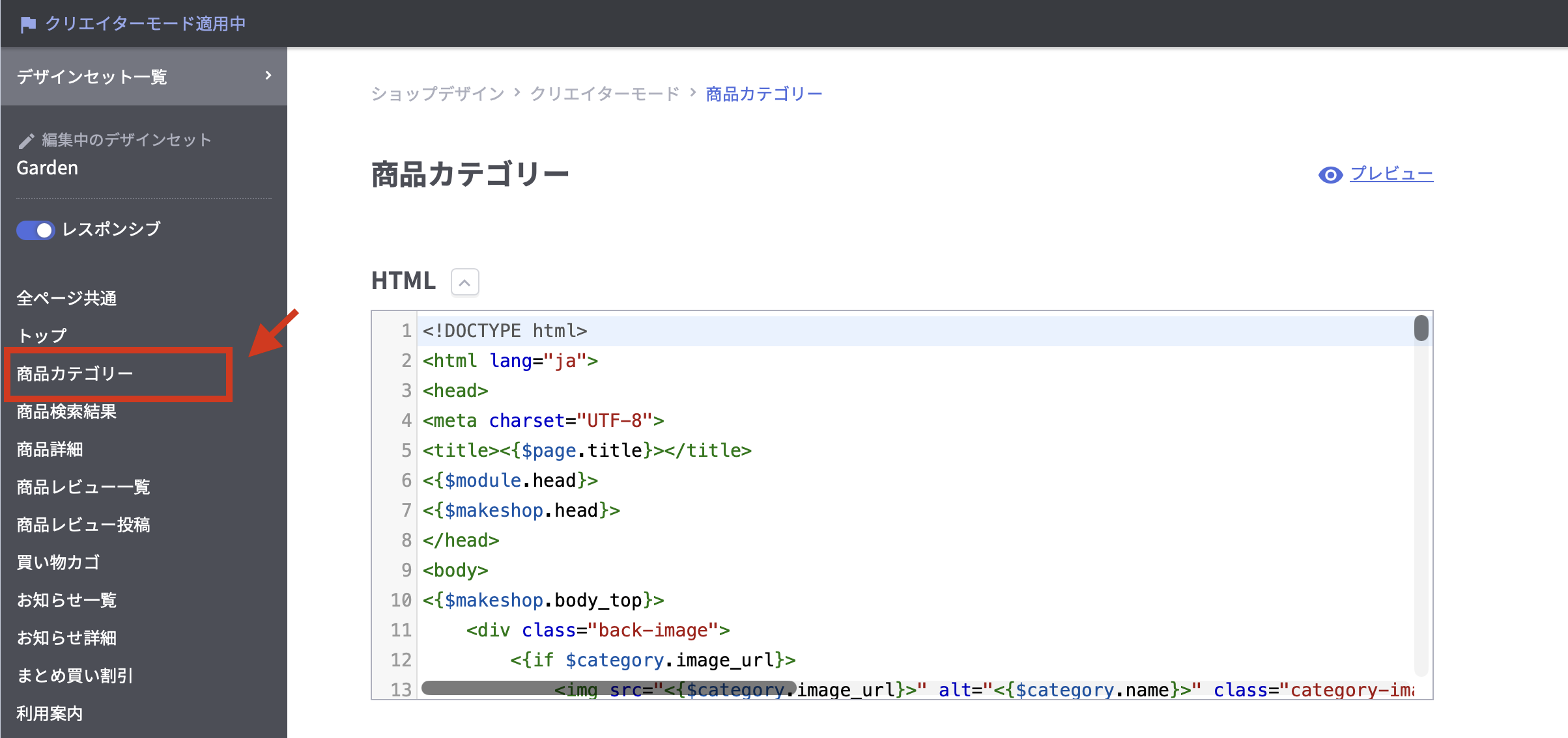 ①makeshop管理画面の「ショップデザイン > テンプレート選択・編集 > コードを編集 > 商品カテゴリー」を開きます。