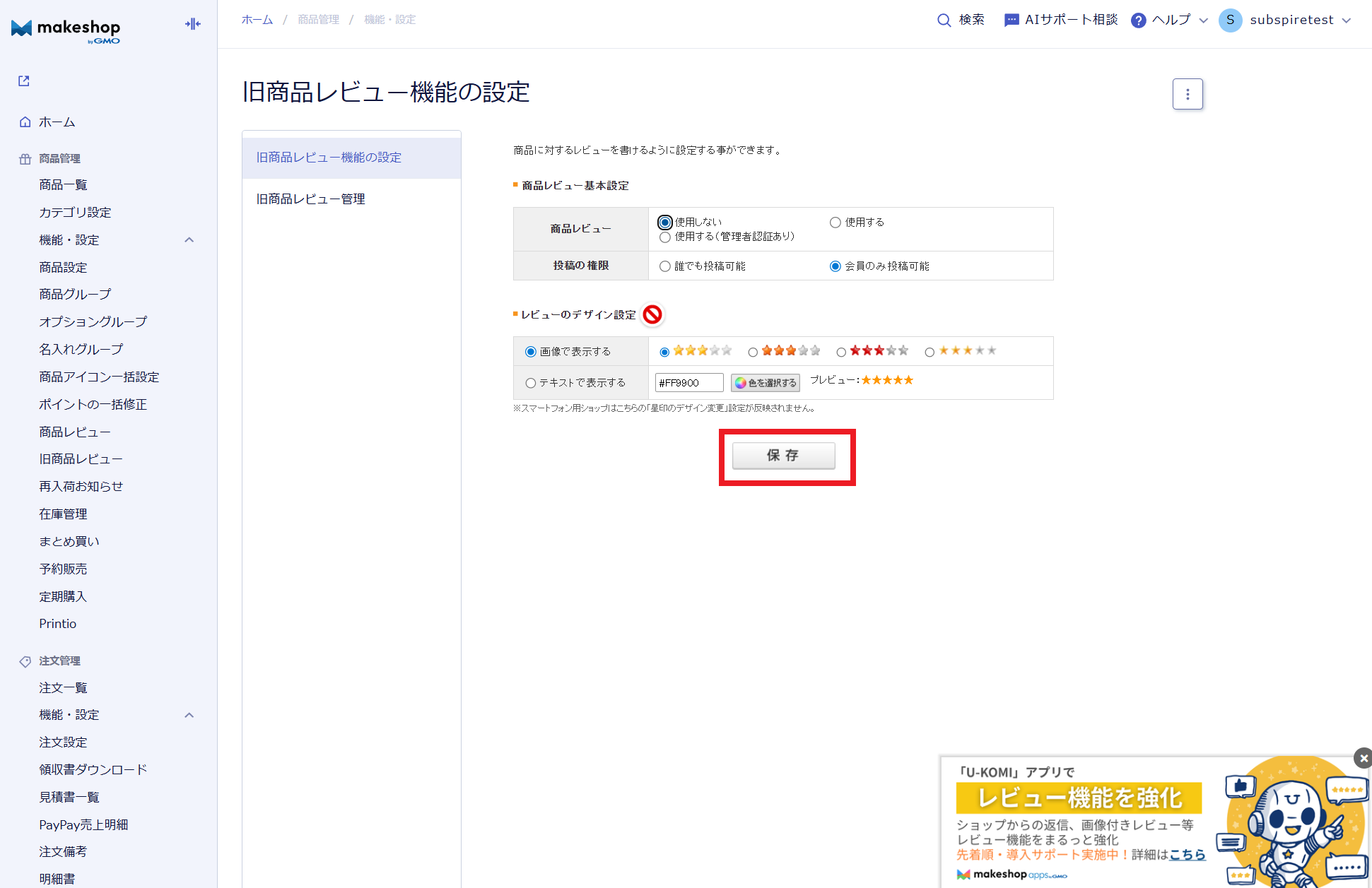 ☝️makeshop管理画面の「商品管理>商品レビュー>商品レビュー機能の設定」から無効化します。