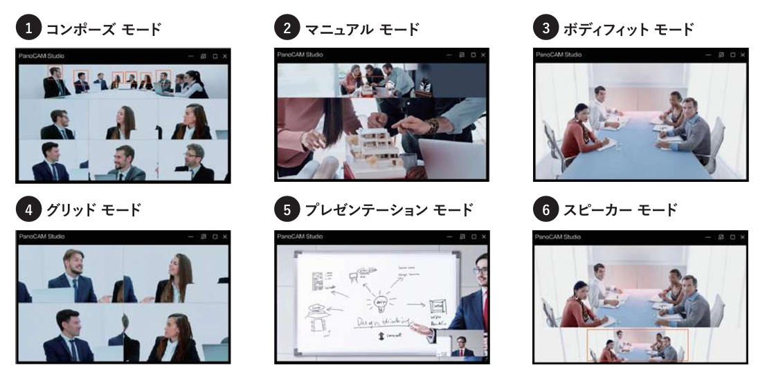 PC等に専用ソフトウェア「PanoCam Studio」をインストールして使用することにより、最適なレイアウトの選択や、人物のオートトラッキングなど本機の機能を最大限活かすことができます。「PanoCam Studio」を使用することで、下記の6つのカメラモードが選択可能となります。