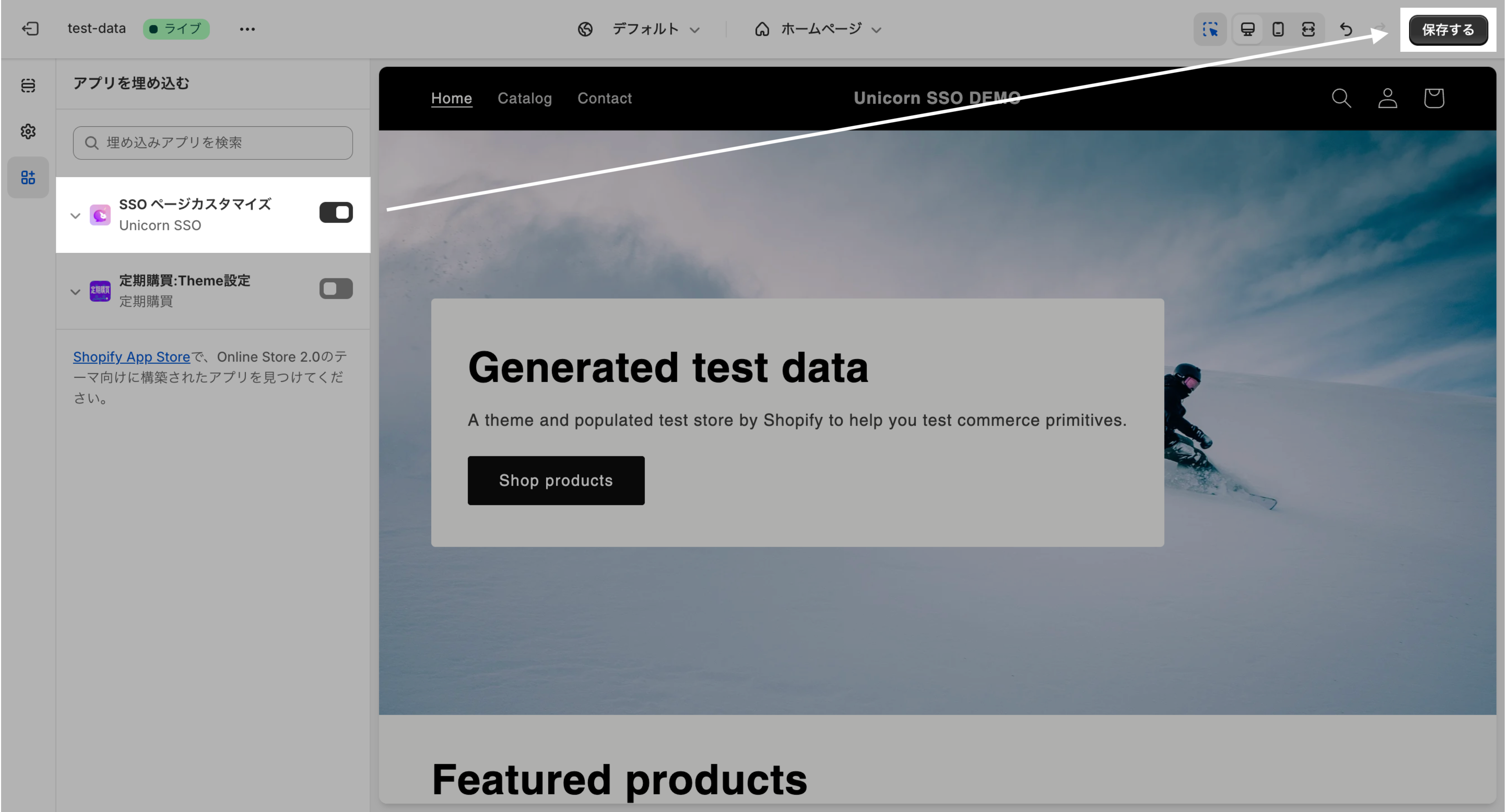 テーマのカスタマイズ画面よりアプリを有効化し、画面右上の[保存する]をクリック