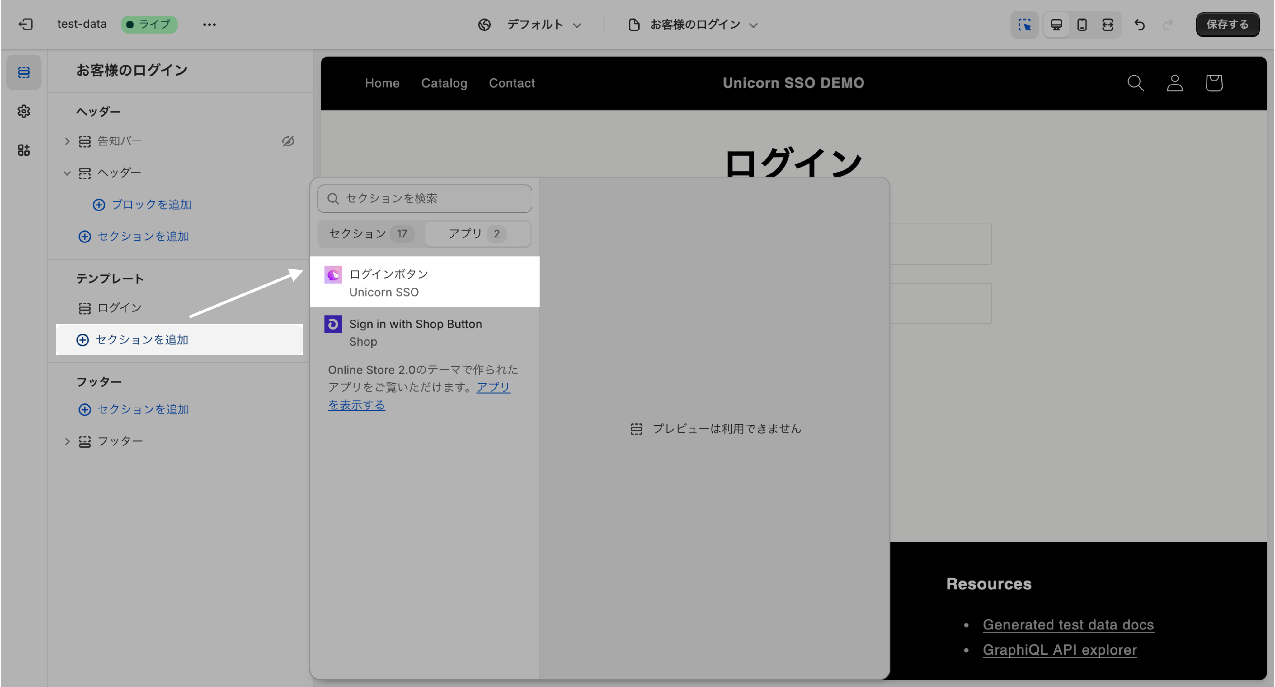 ログインページにて、[セクションを追加]より、アプリの[ログインボタン]を選択