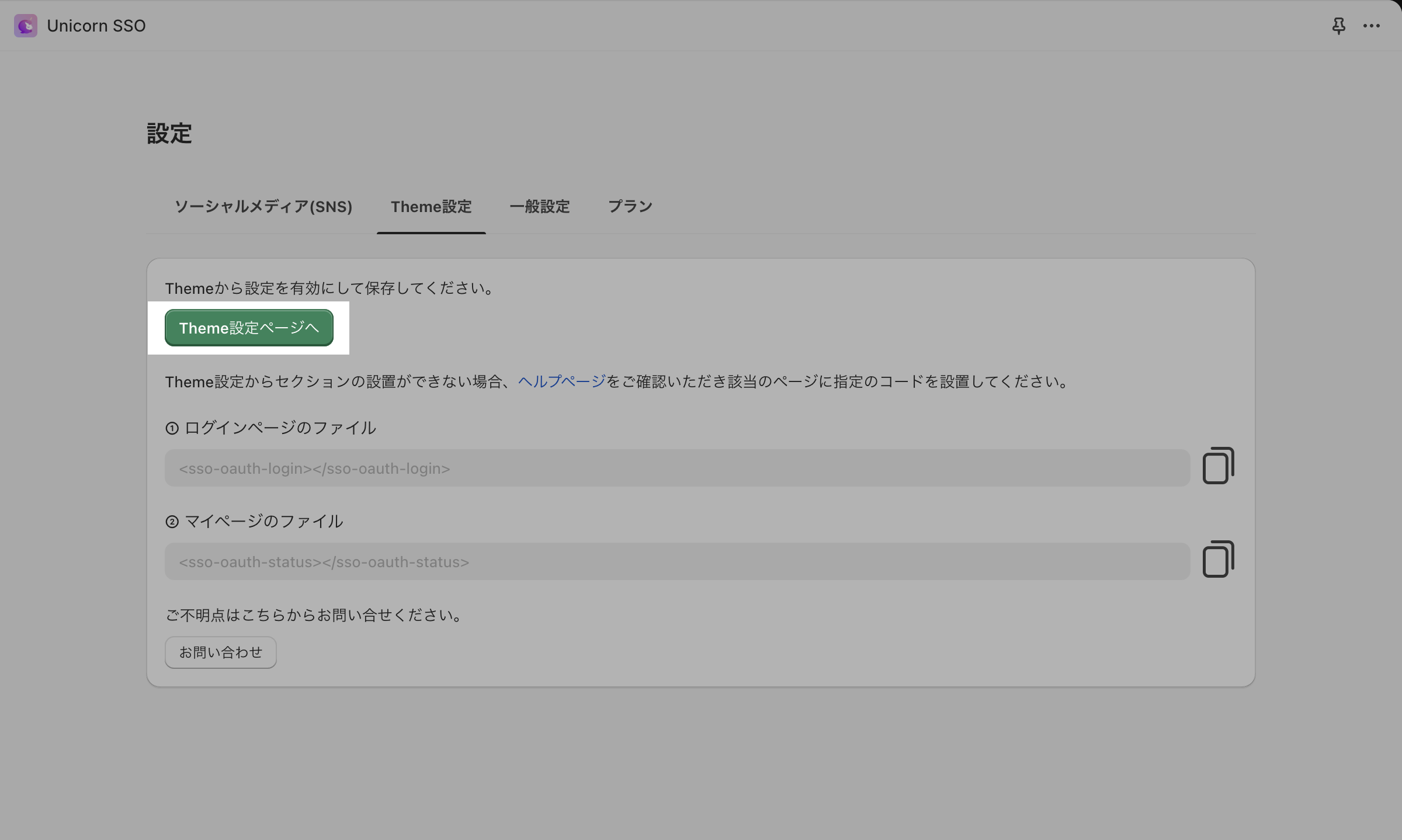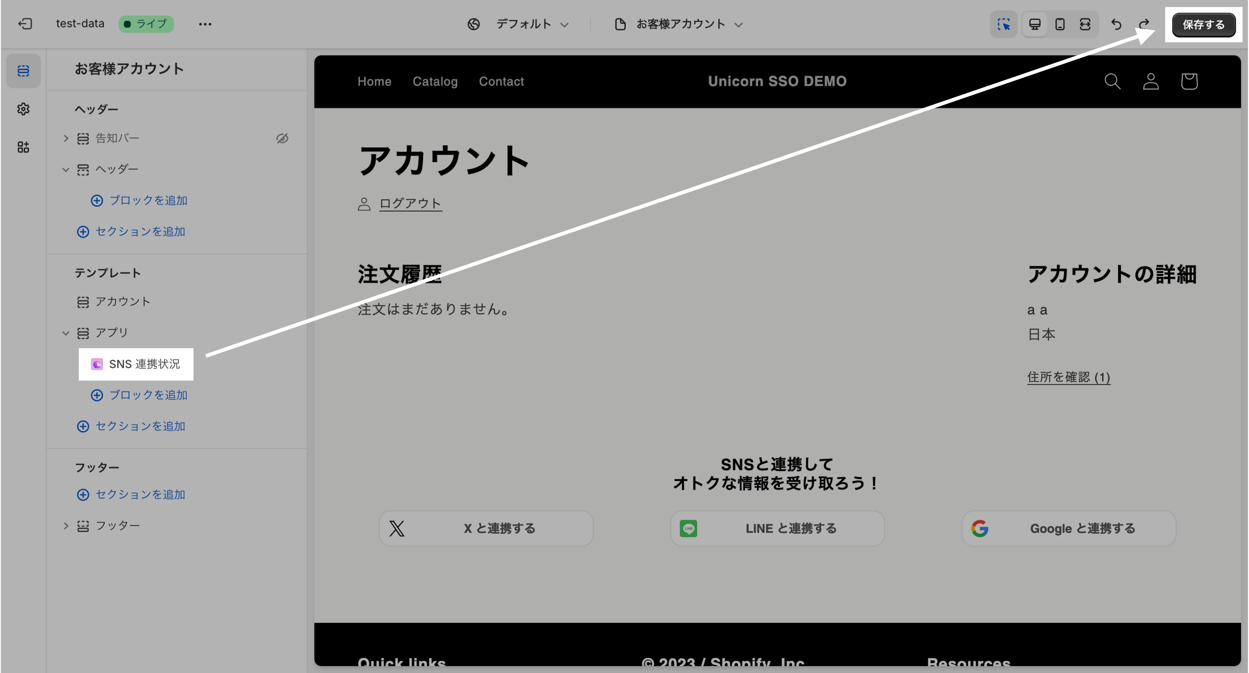 アカウントページ(sections/main-account.liquid*)のコード編集画面を開き、SNS連携状況を表示したい箇所に、以下のコードを追加する。