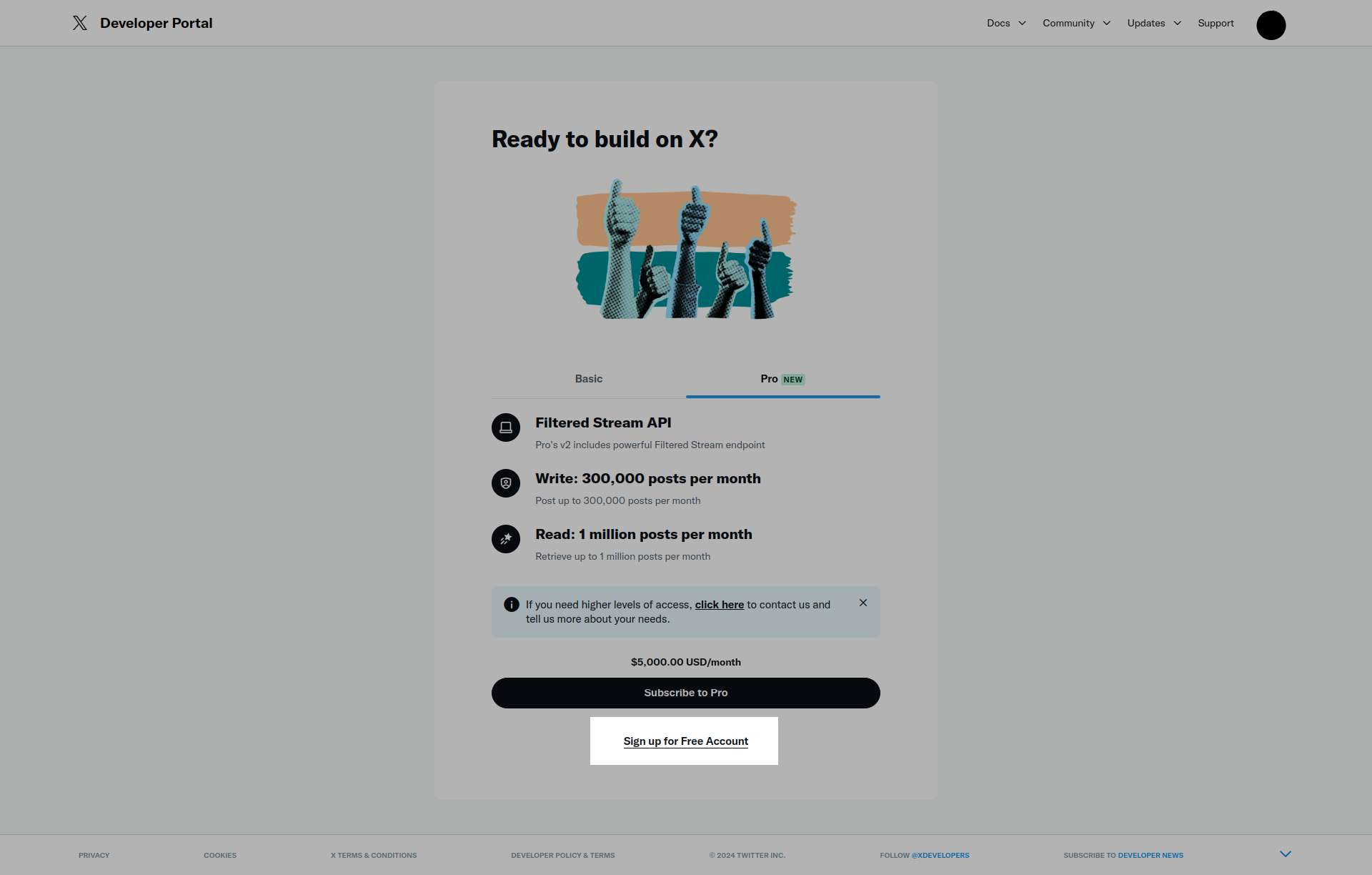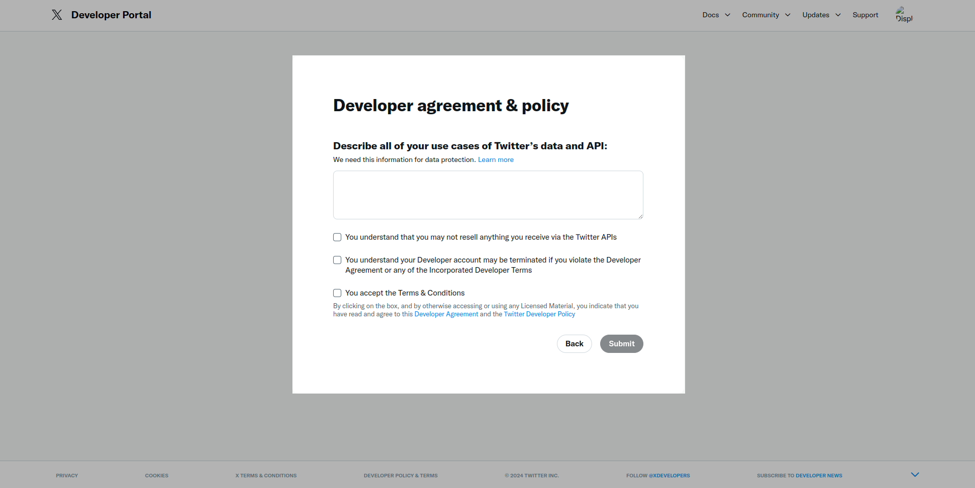 Xアカウントにログインした状態で、以下のURLを開きます。https://developer.twitter.com/en/portal/petition/essential/basic-info