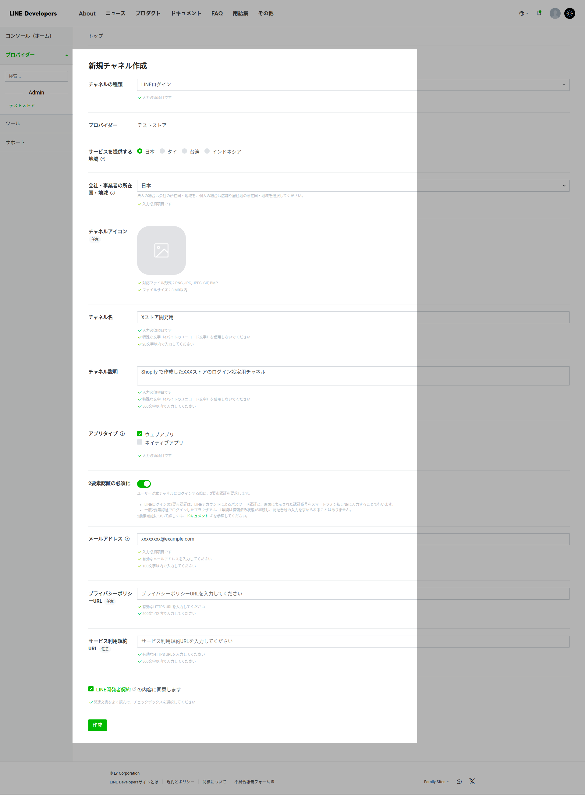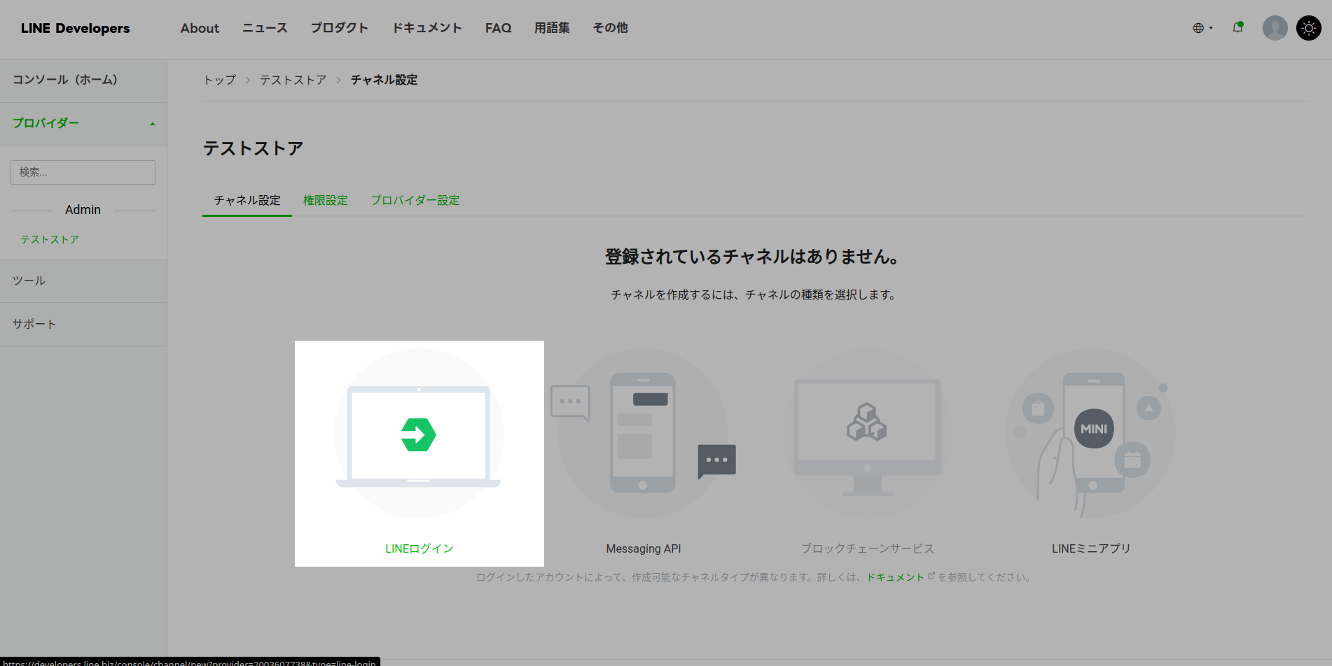 プロバイダー詳細画面でチャネル設定に進み、LINEログインを押します。
