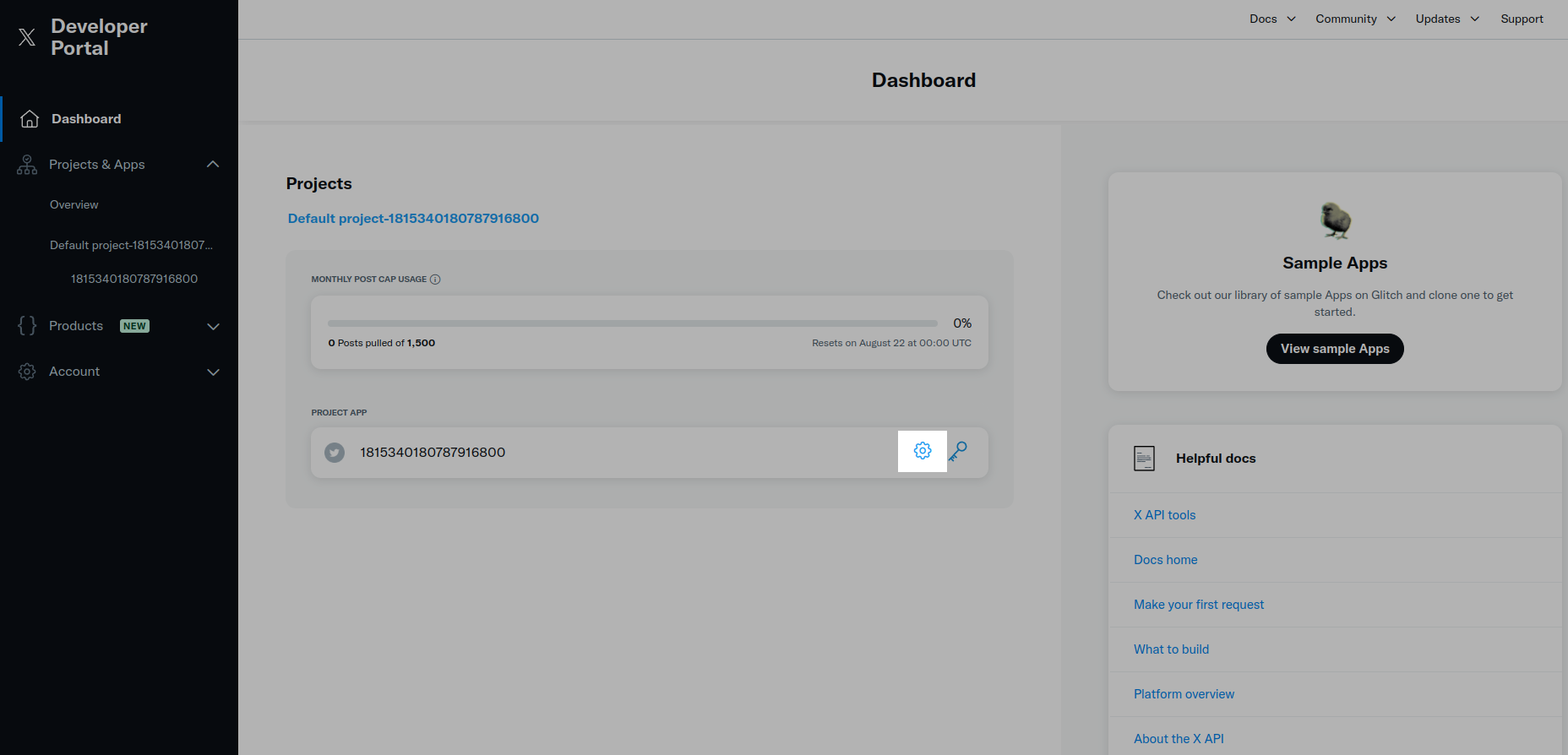 ダッシュボードにて、アプリの歯車アイコンをクリックします。