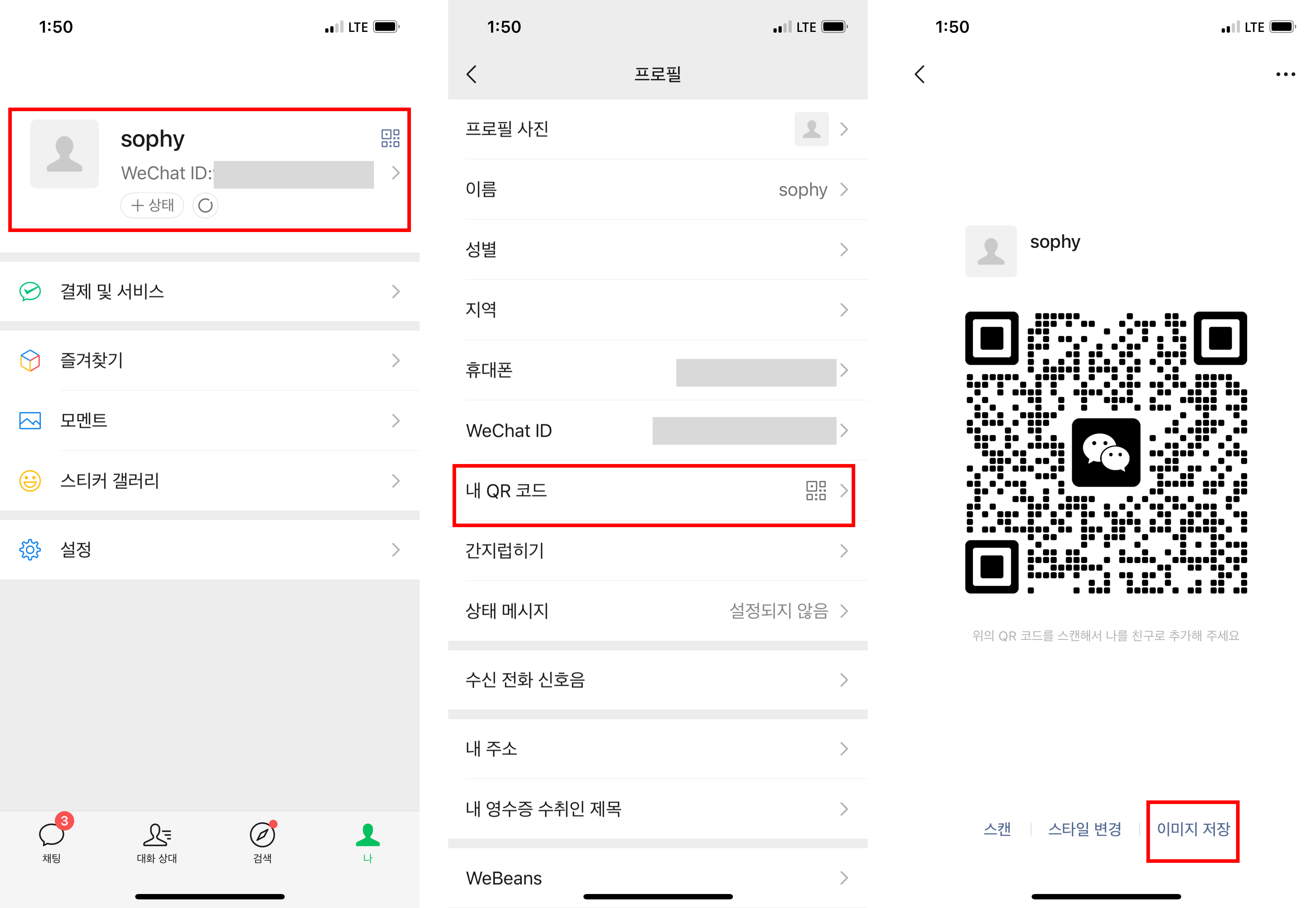 위챗에서 QR 코드 이미지 저장 [위챗 > 나 > 프로필 > 내 QR 코드 > 이미지 저장]