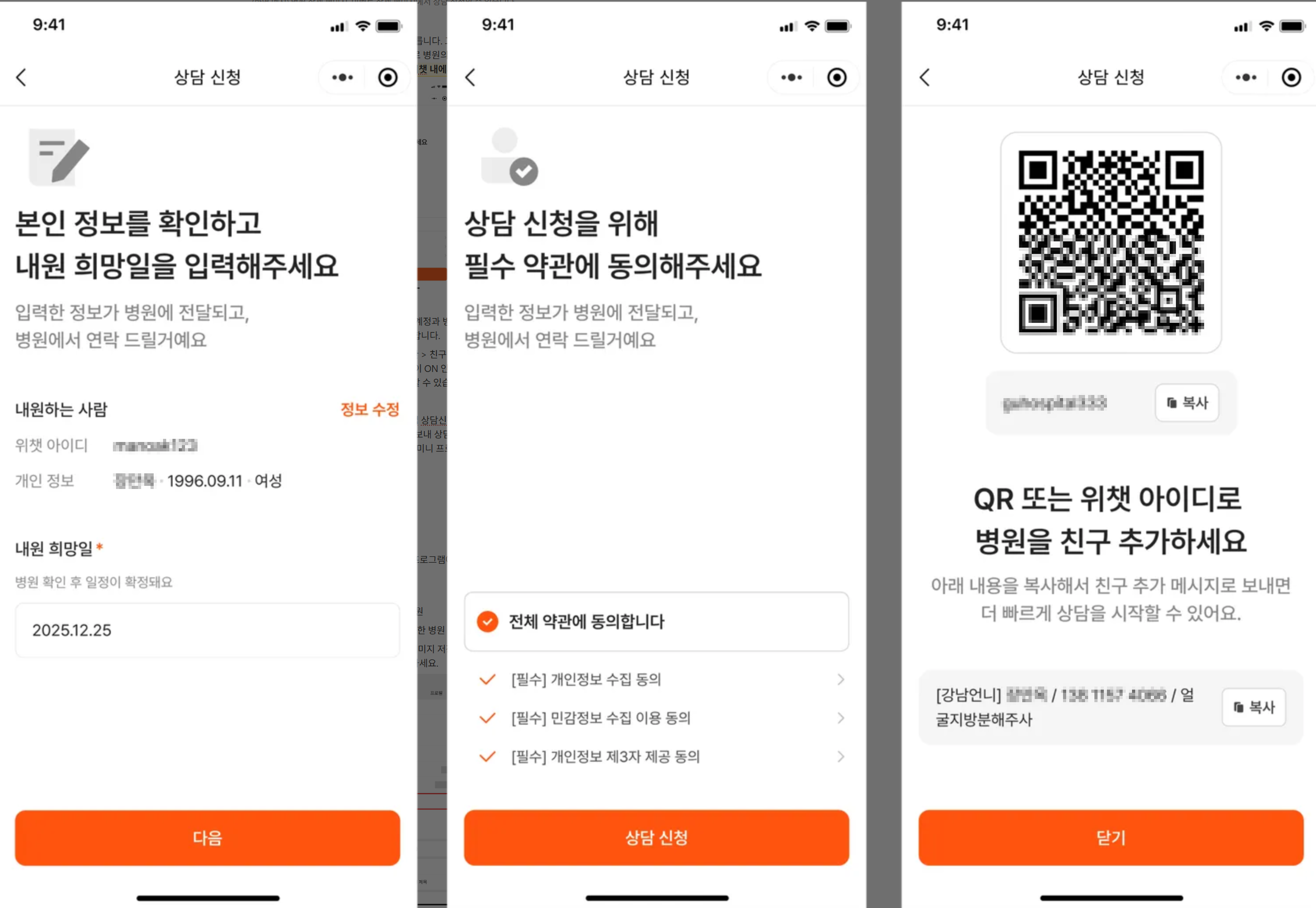 따라서 위챗 미니 프로그램에서는‘병원 탐색 → 이벤트 확인 → 상담 신청 → 위챗 상담 진행’ 중심으로 운영됩니다.