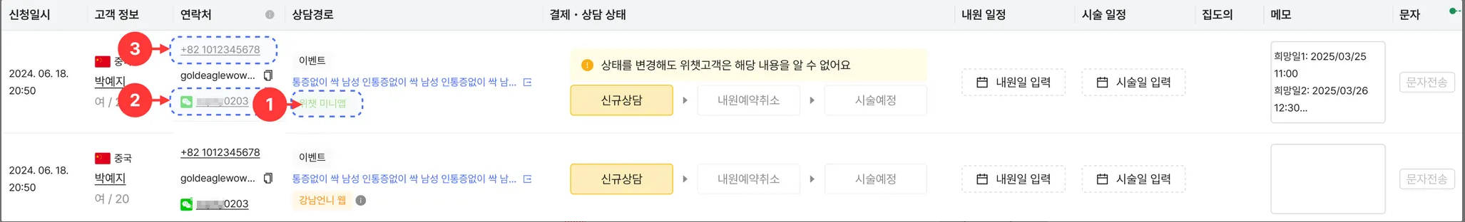 아래 기능은 위챗 미니 프로그램 상담신청 건에 한해 제한됩니다.