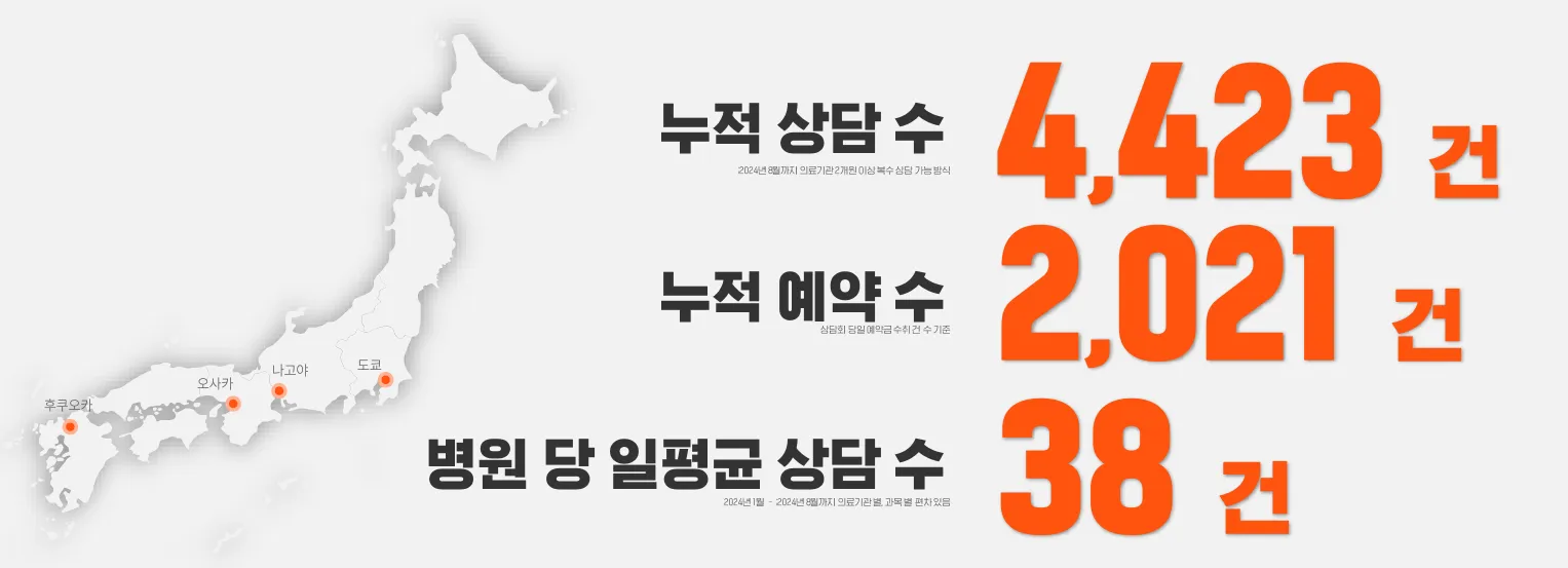 강남언니 상담회는 병원이 일본 환자와 대면으로 만날 수 있는 오프라인 마케팅 상품입니다. 도쿄 시부야에 위치한 강남언니 일본 오피스를 거점으로 오사카, 후쿠오카, 나고야와 같은 일본 주요 대도시에서 60회 이상의 상담회를 성공적으로 개최하였고, 70 곳 이상의 병원이 강남언니 일본 브랜딩 패키지를 통해 적극적으로 일본 고객을 유치하고 있습니다.