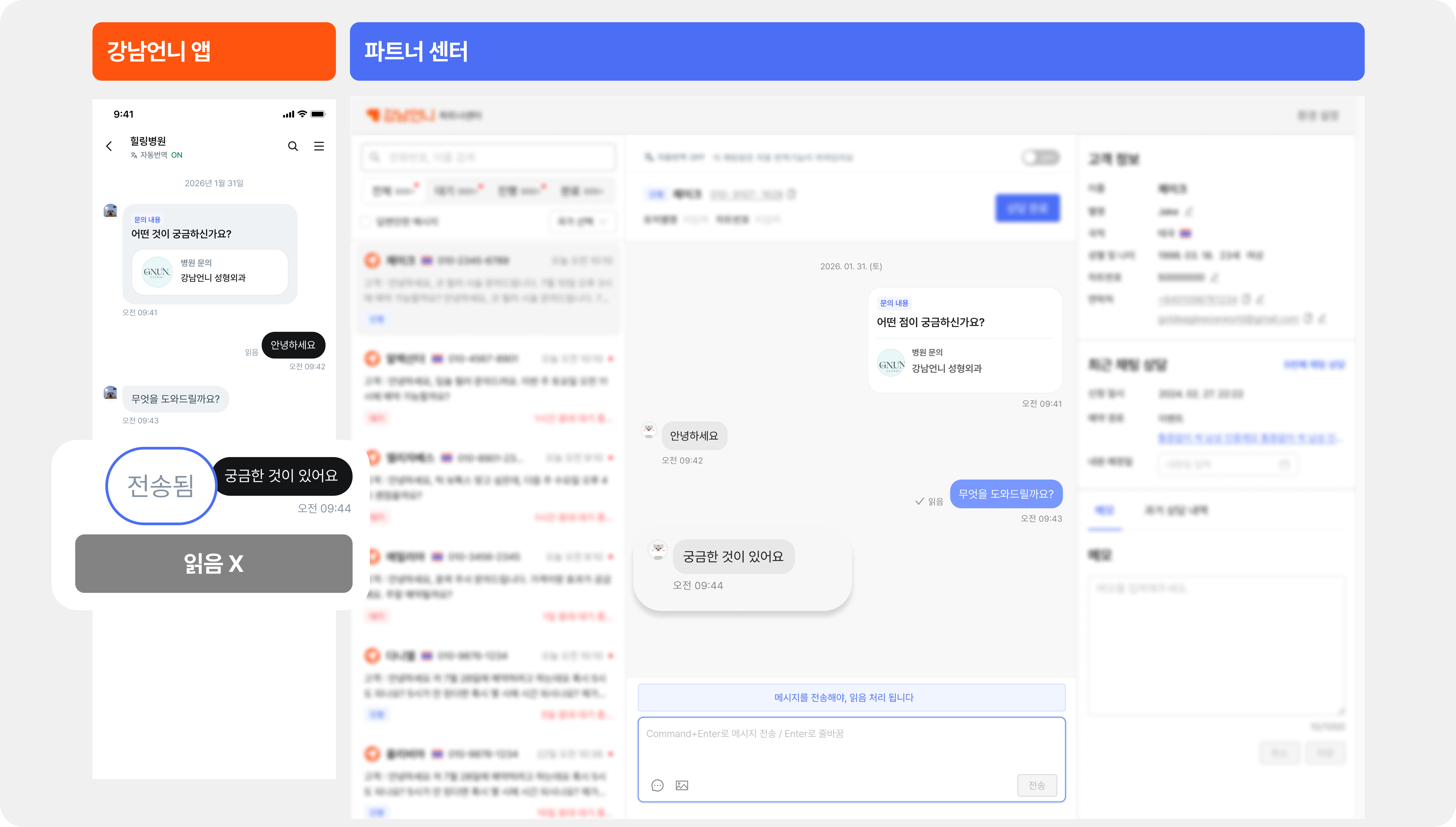 변경: 병원이 채팅방에 들어가 내용을 확인하더라도, '직접 답장을 보내기 전까지는' 고객 화면에 [안 읽음] 상태가 그대로 유지됨.