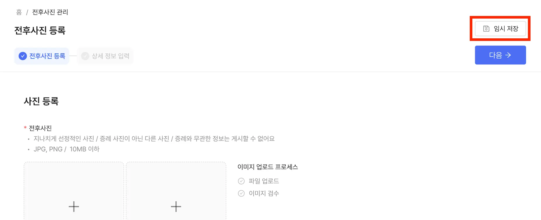 전후사진 등록 중 임시저장 버튼을 통해 임시 저장을 할 수 있어요