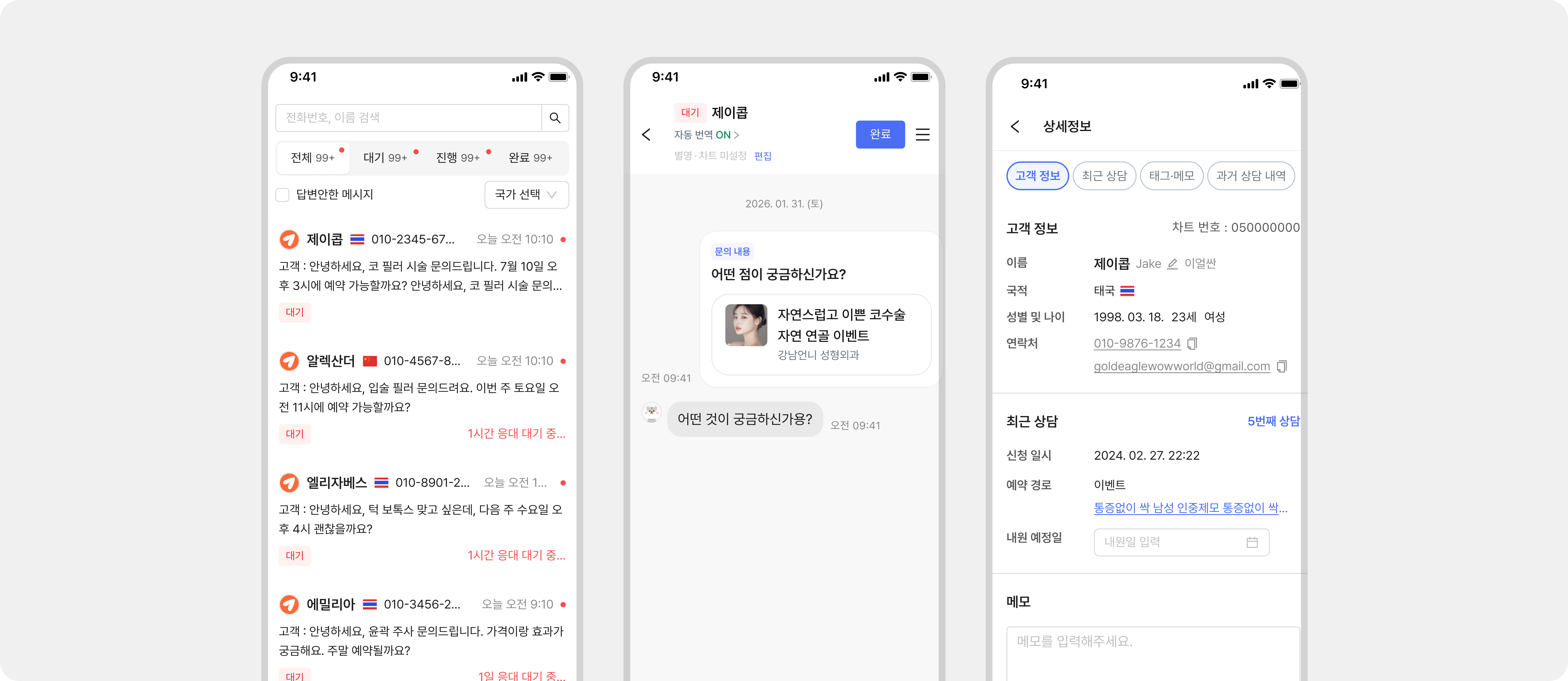모바일 앱에서 나눈 대화, 설정한 내원예정일, 메모 등은 데스크 PC 웹화면에도 똑같이 즉시 반영됩니다. 웹에서 쓰던 상담을 모바일에서 이어서 타닥타닥 치실 수 있으니, 장비만 바꿔가며 물 흐르듯 자연스럽게 업무를 진행하세요.