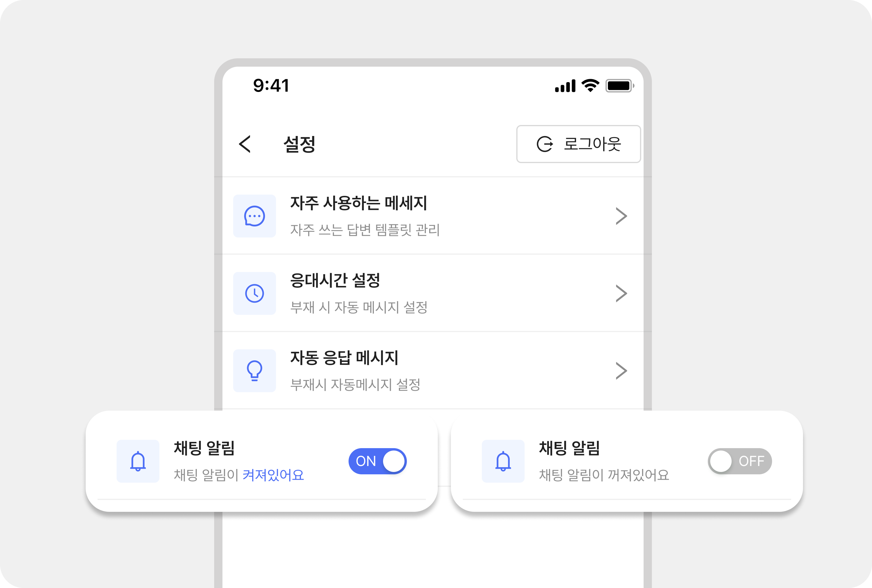퇴근 후 온전한 휴식이 필요하시다면 스마트폰의 '알림 끄기'를 설정해 두시면 됩니다. 또한 앞서 안내해 드린 [채팅 응대시간 및 자동응답] 기능을 잘 설정해 두셨다면, 퇴근 후 고객이 문의하더라도 든든한 시스템 봇이 1차 응대를 알아서 처리해 주니 다음 날 출근해서 앱이나 PC로 여유롭게 확인하시면 됩니다.