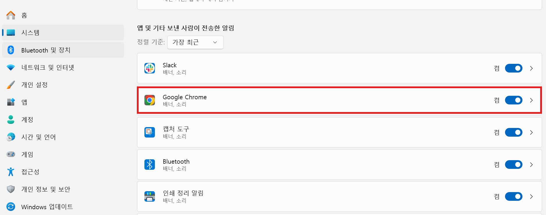 윈도우: ‘알림이 소리를 재생하도록 허용’ ON