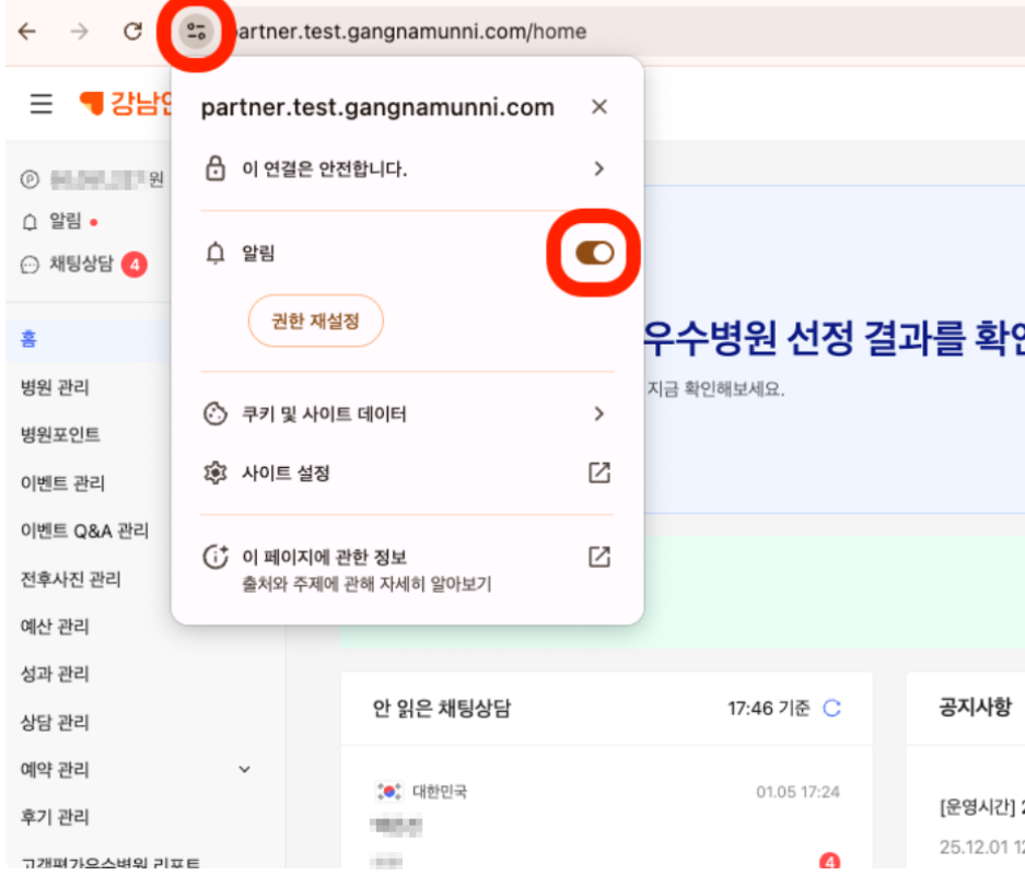 병원에서 고객 채팅을 놓치지 않도록,파트너센터에서 고객의 신규 메시지를 바로 확인할 수 있는 알림 기능이 새롭게 추가되었어요.