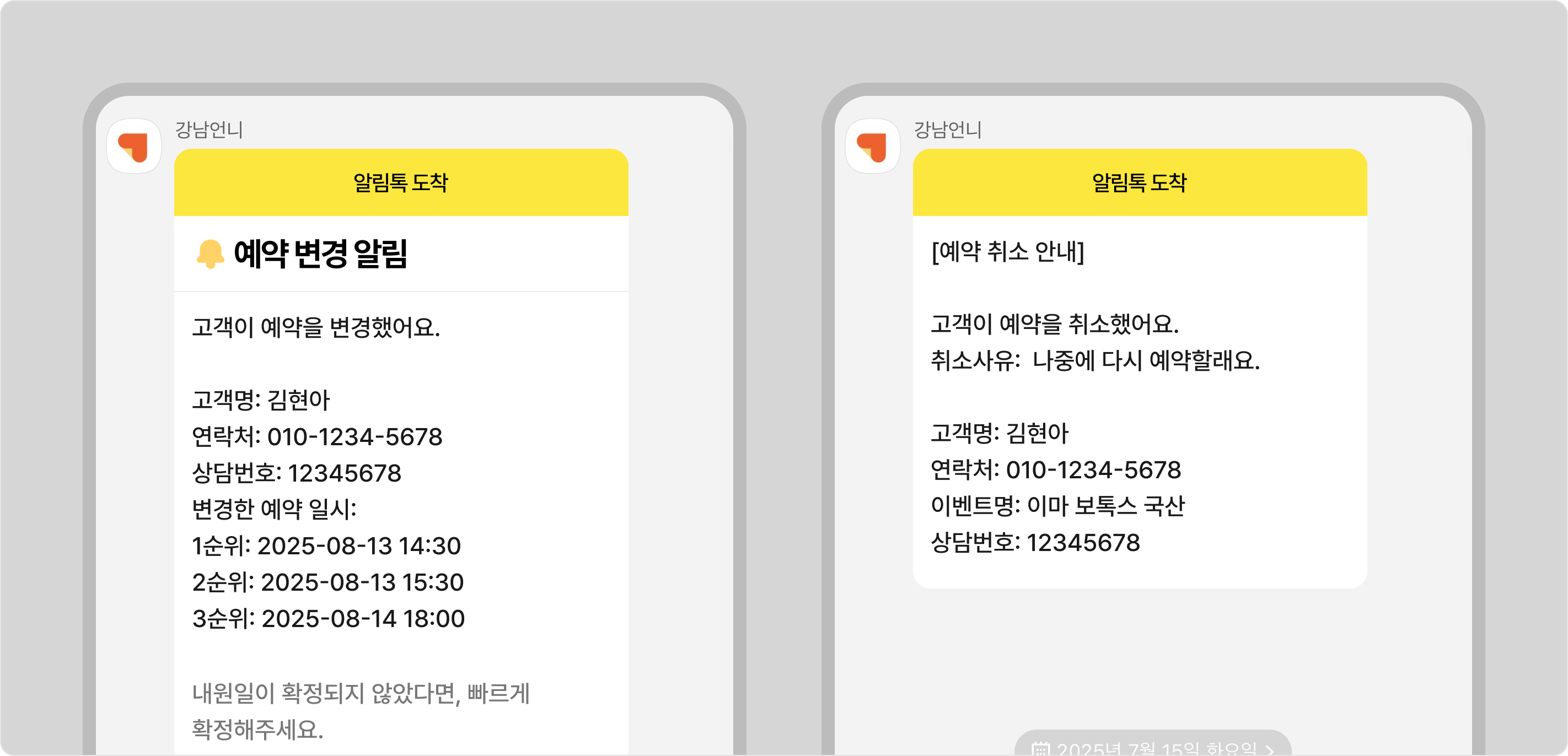 고객이 예약을 변경/취소하면 카카오톡으로 알림톡을 받을 수 있어요.