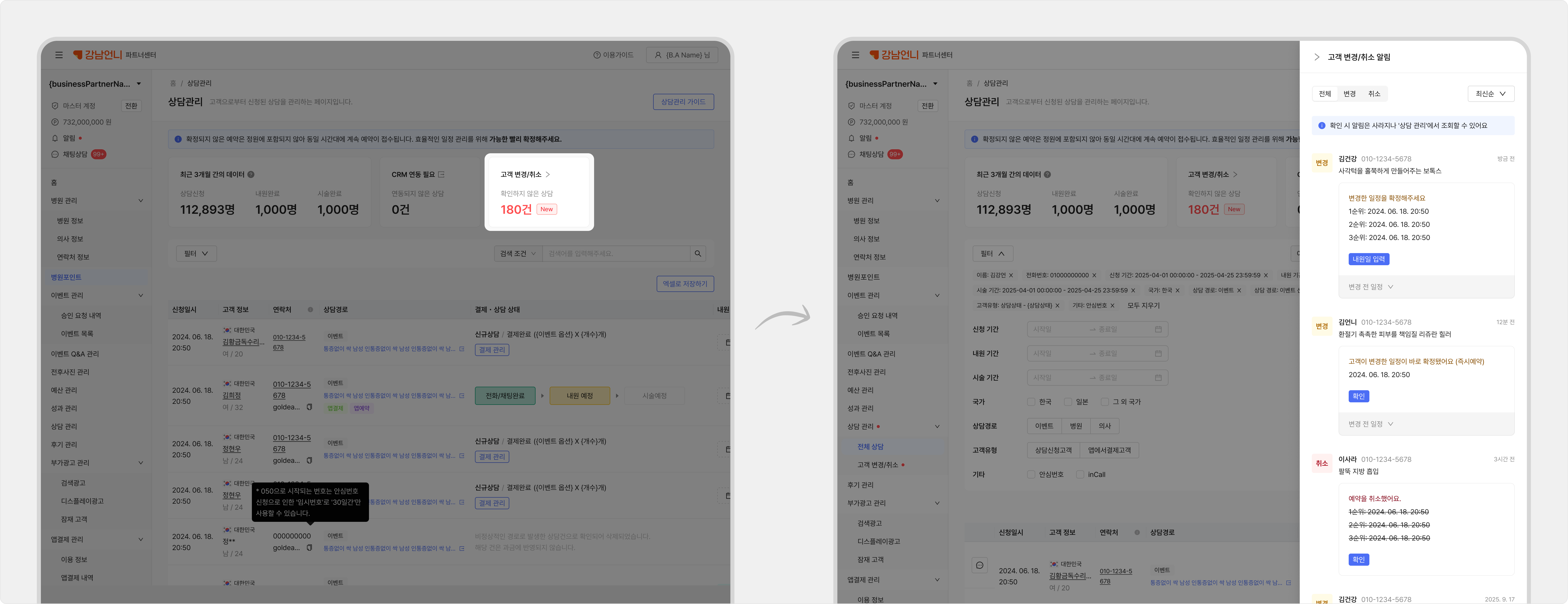 고객이 예약을 변경하면 파트너센터 > 고객 변경/취소와 카카오톡 알림톡으로 알 수 있어요.