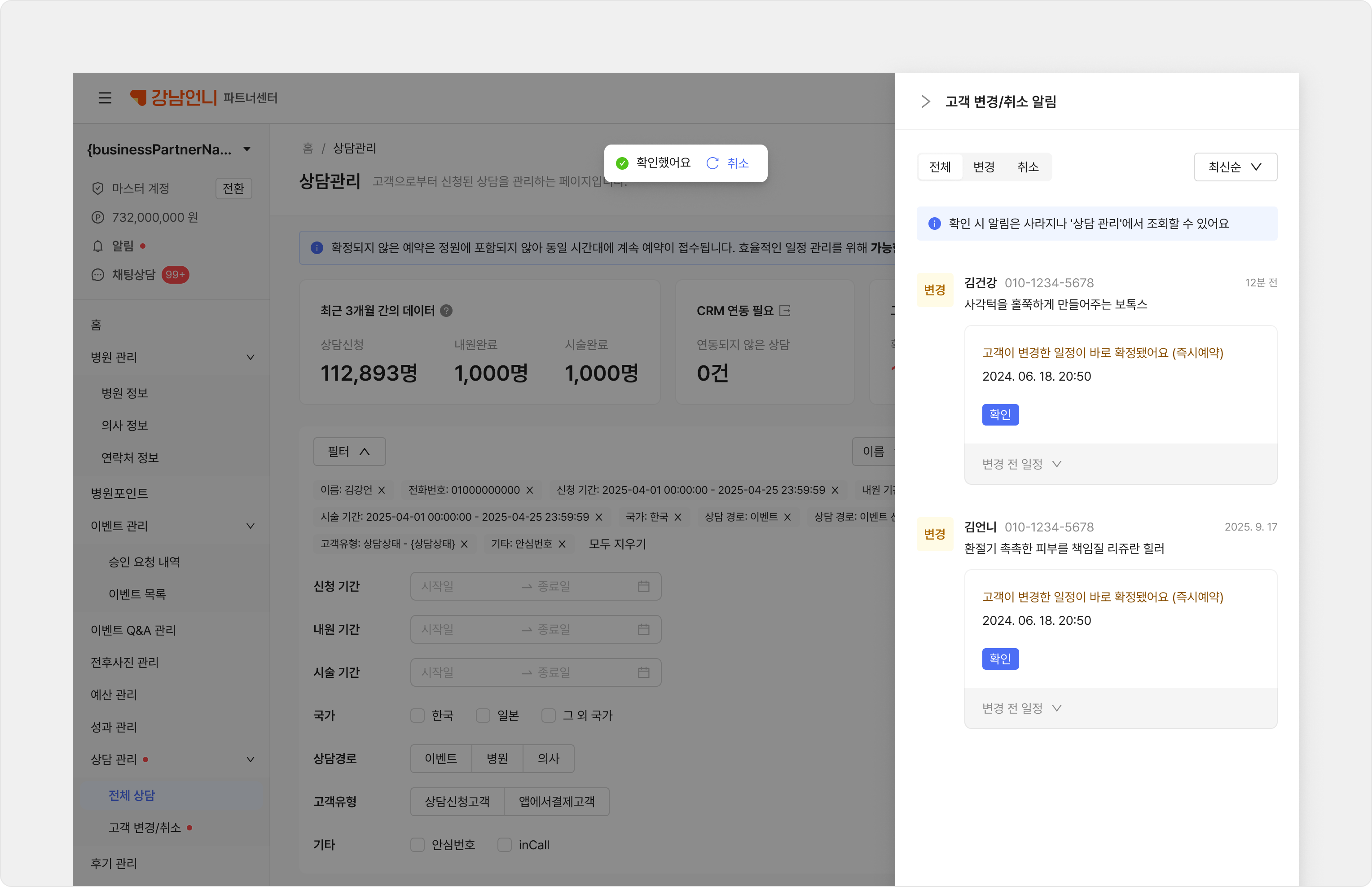 만약 고객이 병원에 직접 취소를 요청한다면, 소통 후 파트너센터에서 취소 처리해 주세요.