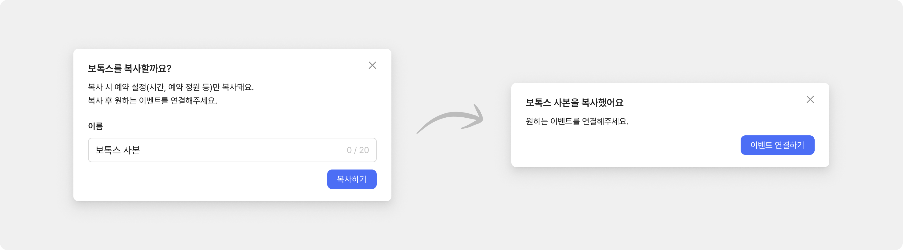 복사하면 설정 값(예약 가능 시간, 예약 정원, 확정 방식 등)은 복사되지만, 연결된 이벤트는 복사되지 않아요.