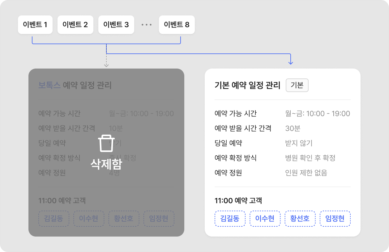 삭제한 예약 일정 관리에 연결되었던 이벤트는 모두 ‘기본 예약 일정 관리’로 자동 연결돼요.
