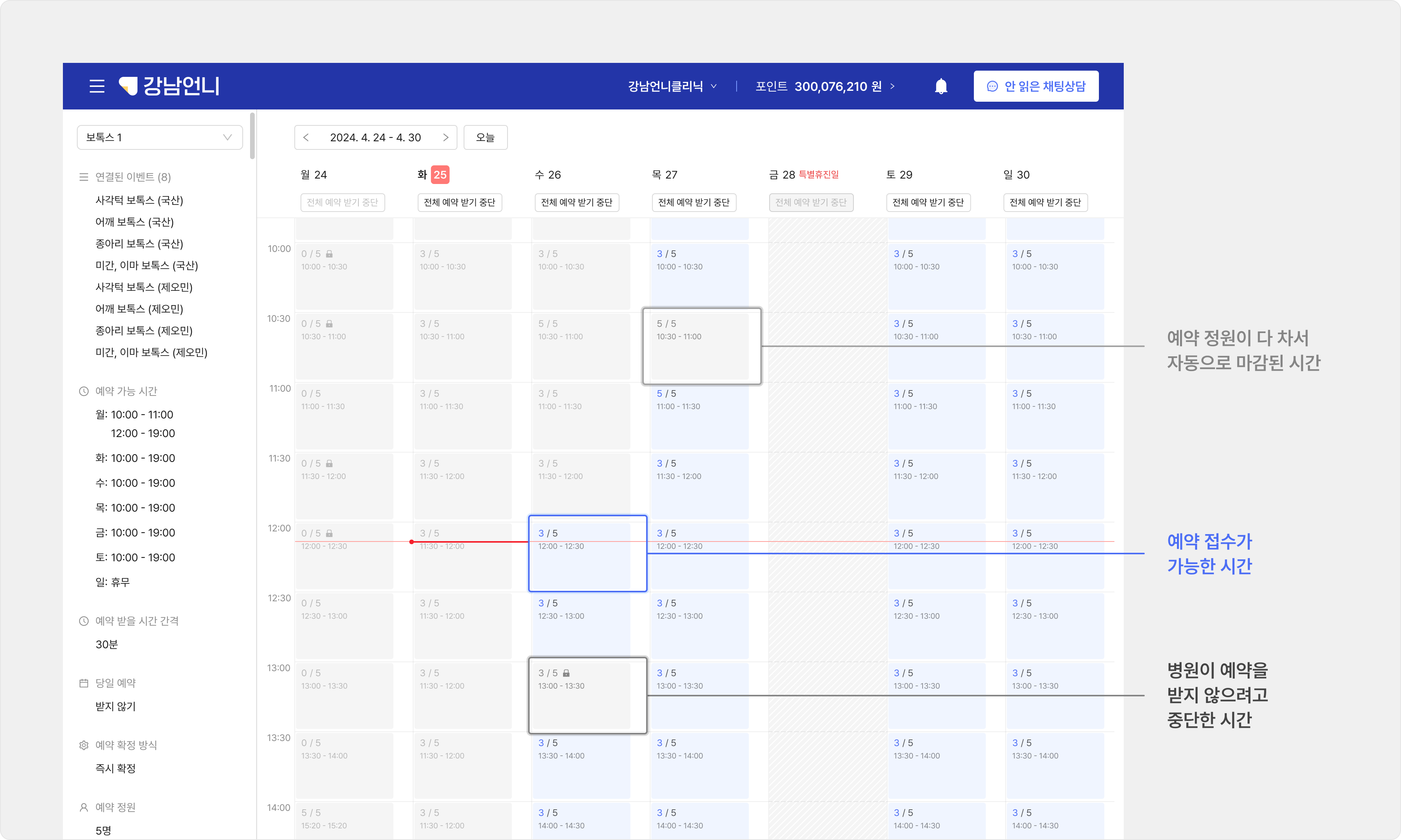 예약 일정 관리마다 ‘예약 인원이 다 차서 마감된 시간’과 ‘접수를 받고 있는 시간’, ‘예약을 받지 않으려고 중단한 시간’을 한 눈에 확인할 수 있어요.