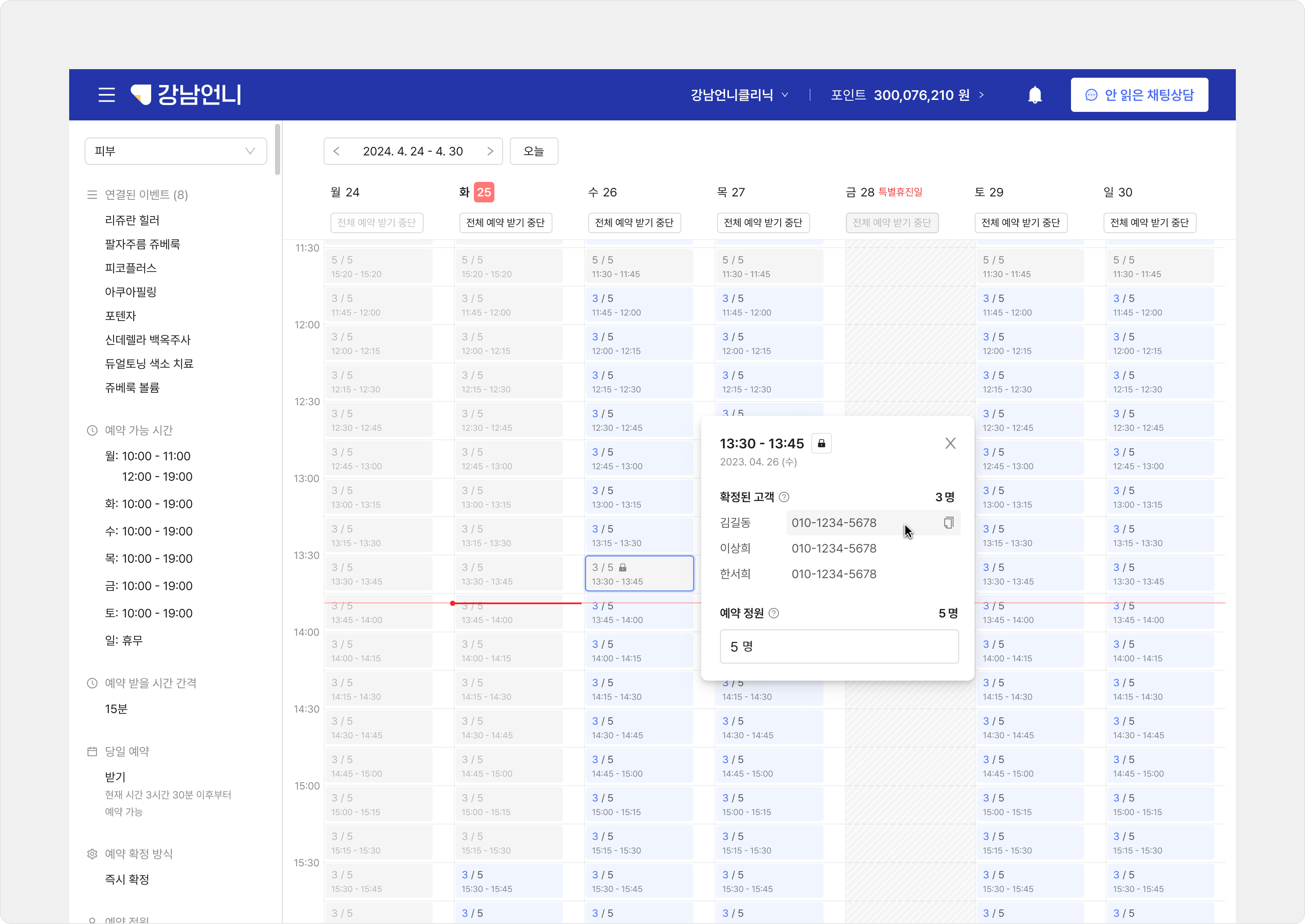 원하는 시간대를 클릭하면, 이 시간에 예약이 확정된 고객 정보를 확인할 수 있어요.