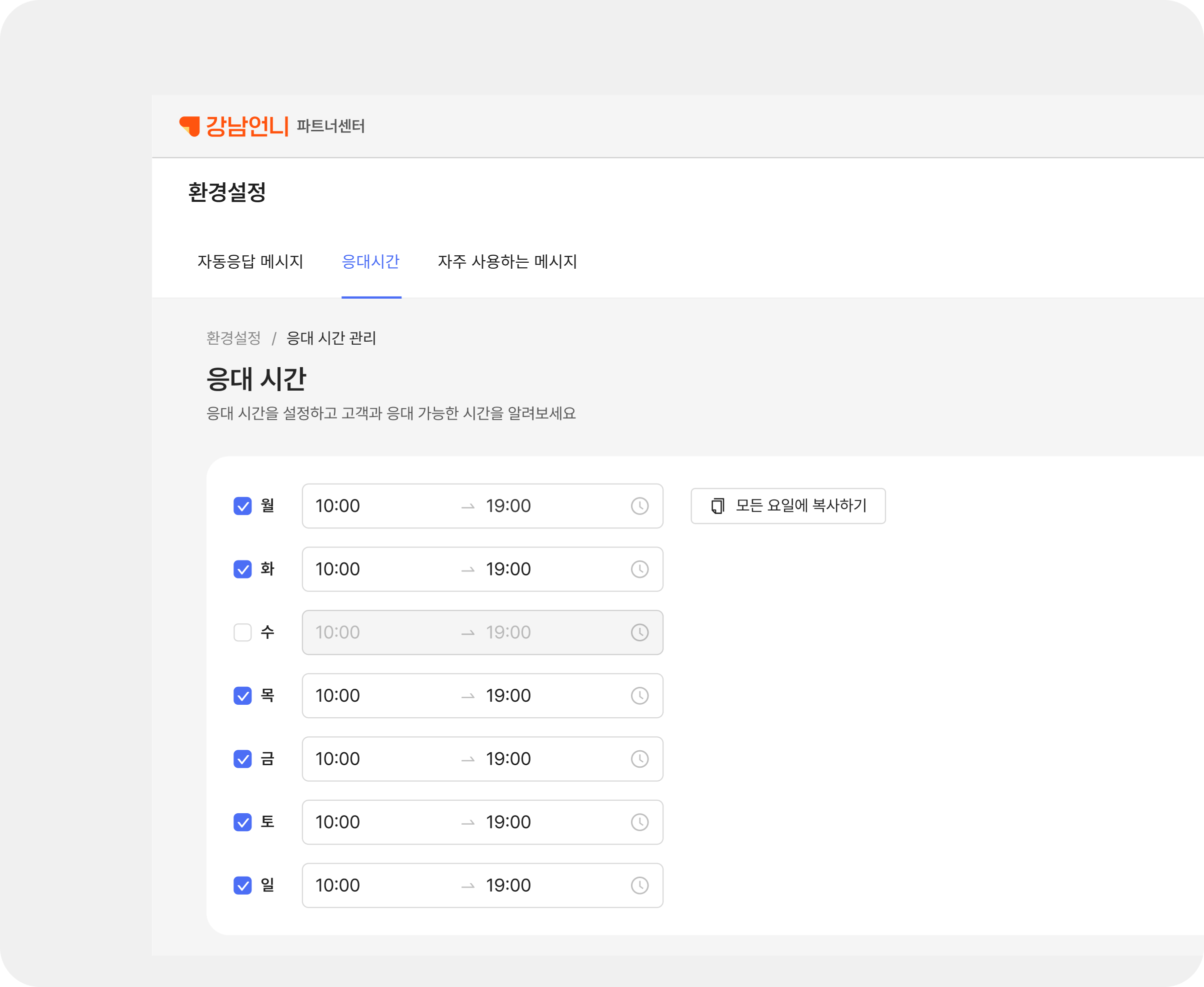설정을 누락하시더라도 기본값으로 안전하게 작동하며, 주말과 평일 야간에는 '응대시간 외 메시지'가 발송됩니다. 하지만 우리 병원만의 정확한 스케줄에 맞추기 위해, 환경설정에서 요일과 시간을 꼭 한번 점검해 주시는 것을 적극 권장합니다!