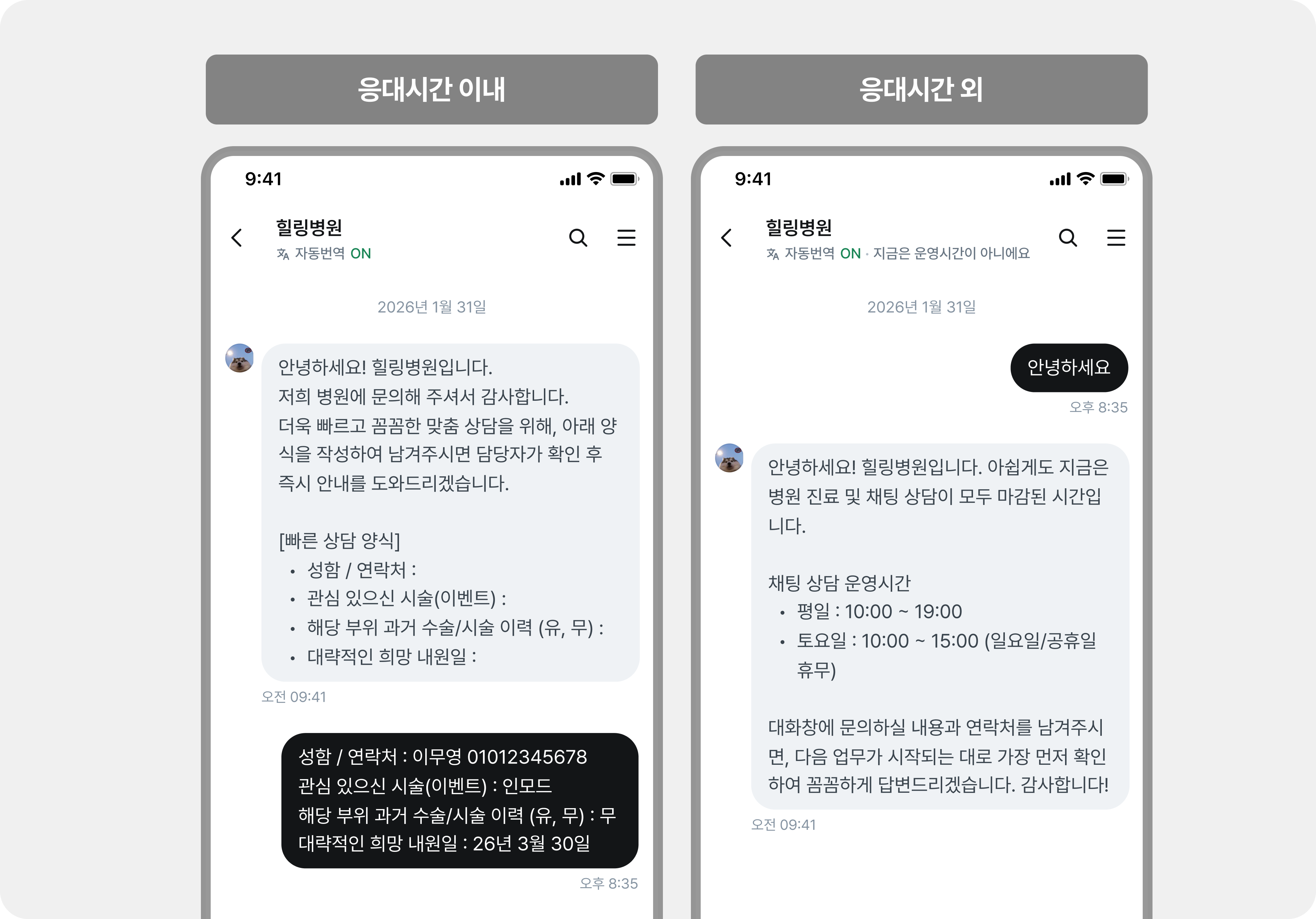 퇴근 후나 진료 중 바쁠 때 쏟아지는 문의, 여전히 잘 대처하고 계신가요? 우리 병원의 워라밸 지킴이, '채팅 응대시간 설정'과 '자동응답 메시지' 기능이 외국인 환자를 위한 글로벌 다국어 지원과 함께 든든하게 작동하고 있습니다.