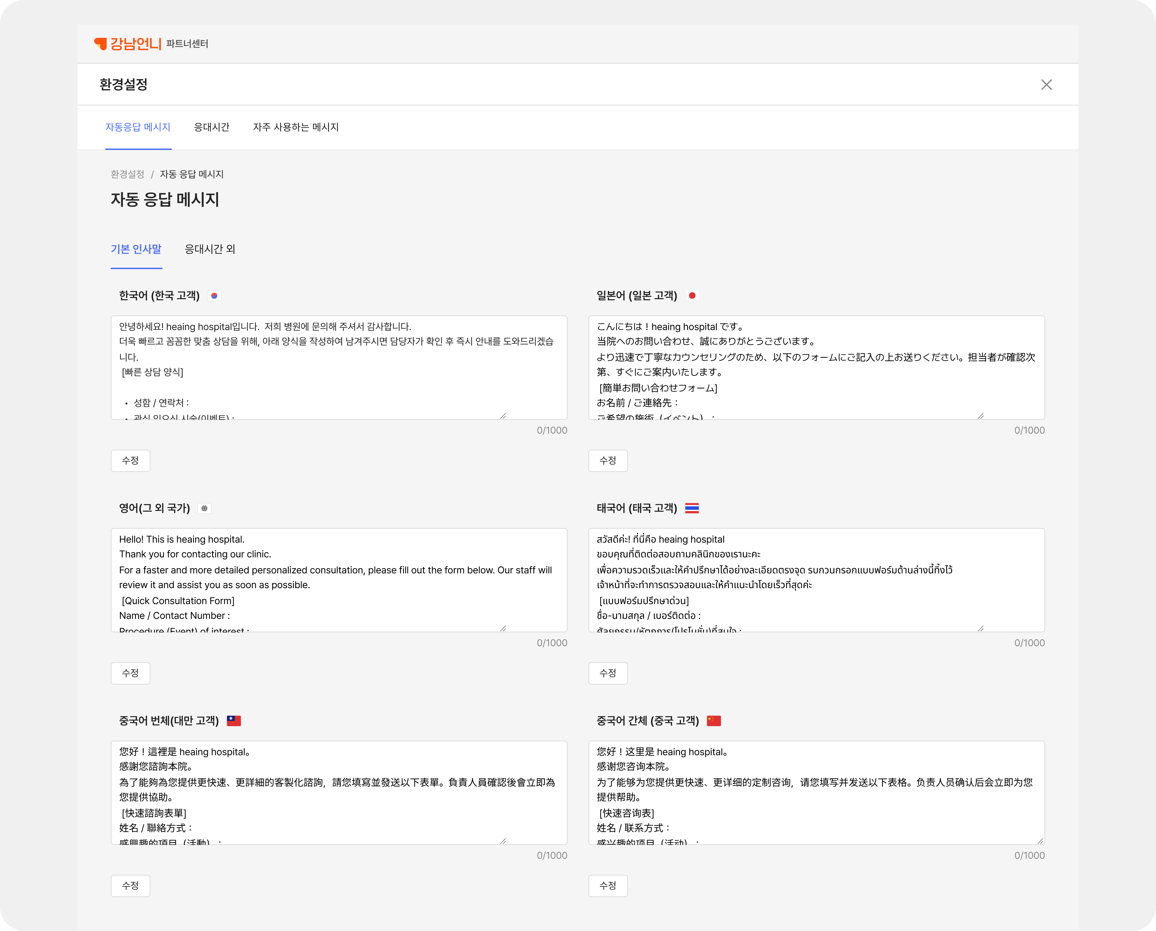 한국어는 기본! 일본어, 영어, 태국어, 대만어(번체), 중국어(간체)까지 총 6개 국어로 우리 병원만의 자동응답 메시지를 직접 설정할 수 있습니다. 각 국가의 고객이 문의를 남기면 해당 언어에 맞춰 시스템이 알아서 응답하므로, 외국인 코디네이터가 퇴근한 후에도 안심할 수 있습니다.