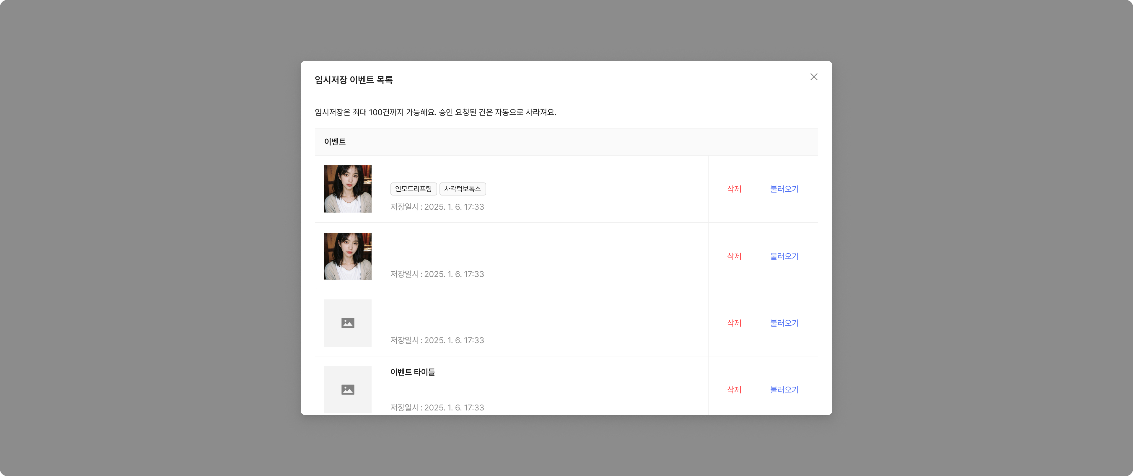 해당 목록에서 임시저장된 이벤트의 삭제와 불러오기가 가능해요.