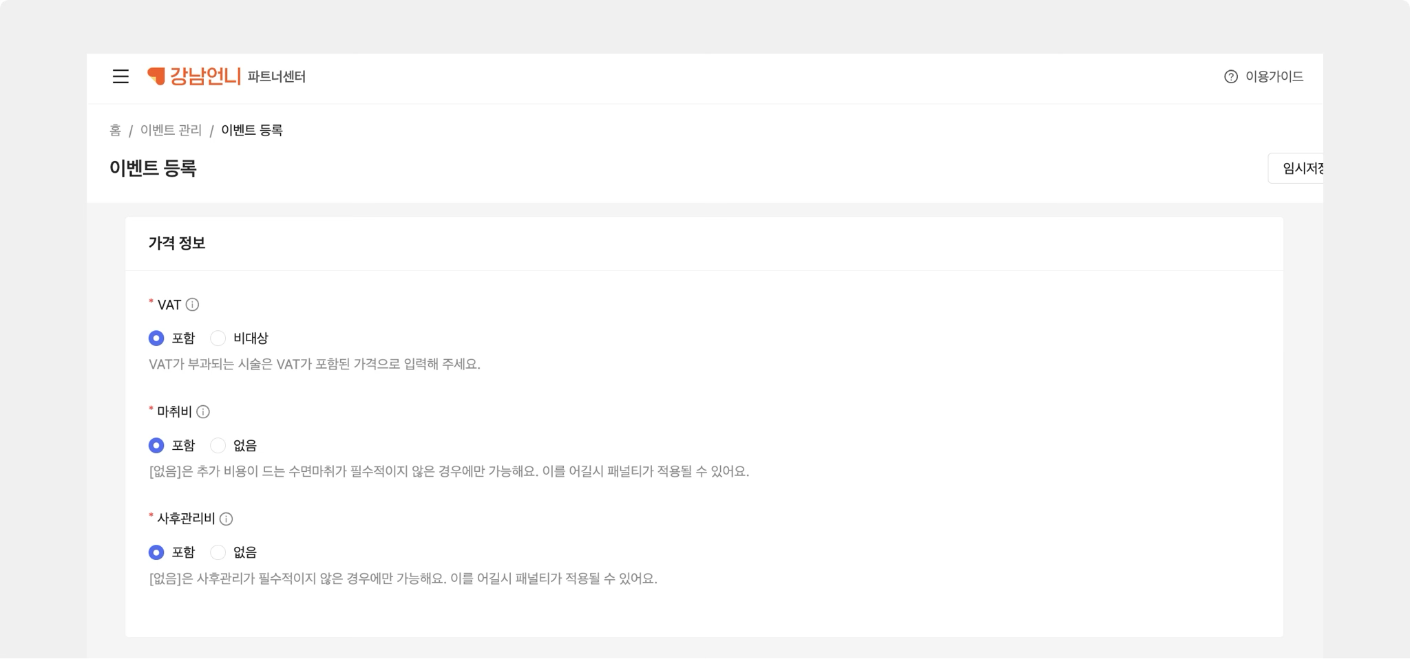 기본적으로 발생되는 VAT / 마취비 / 사후관리비는 모두 포함하여 정보를 입력해 주세요.
