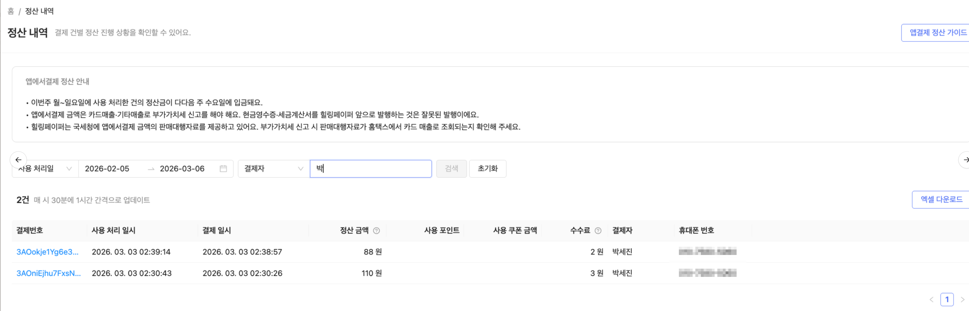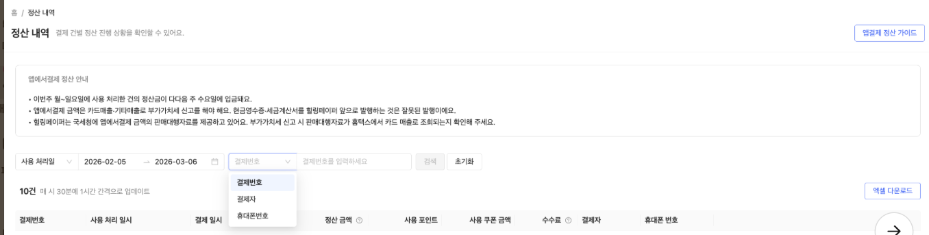 이제 정산 내역을 조회할 때 결제번호뿐 아니라 고객 이름과 전화번호로도 검색할 수 있습니다.