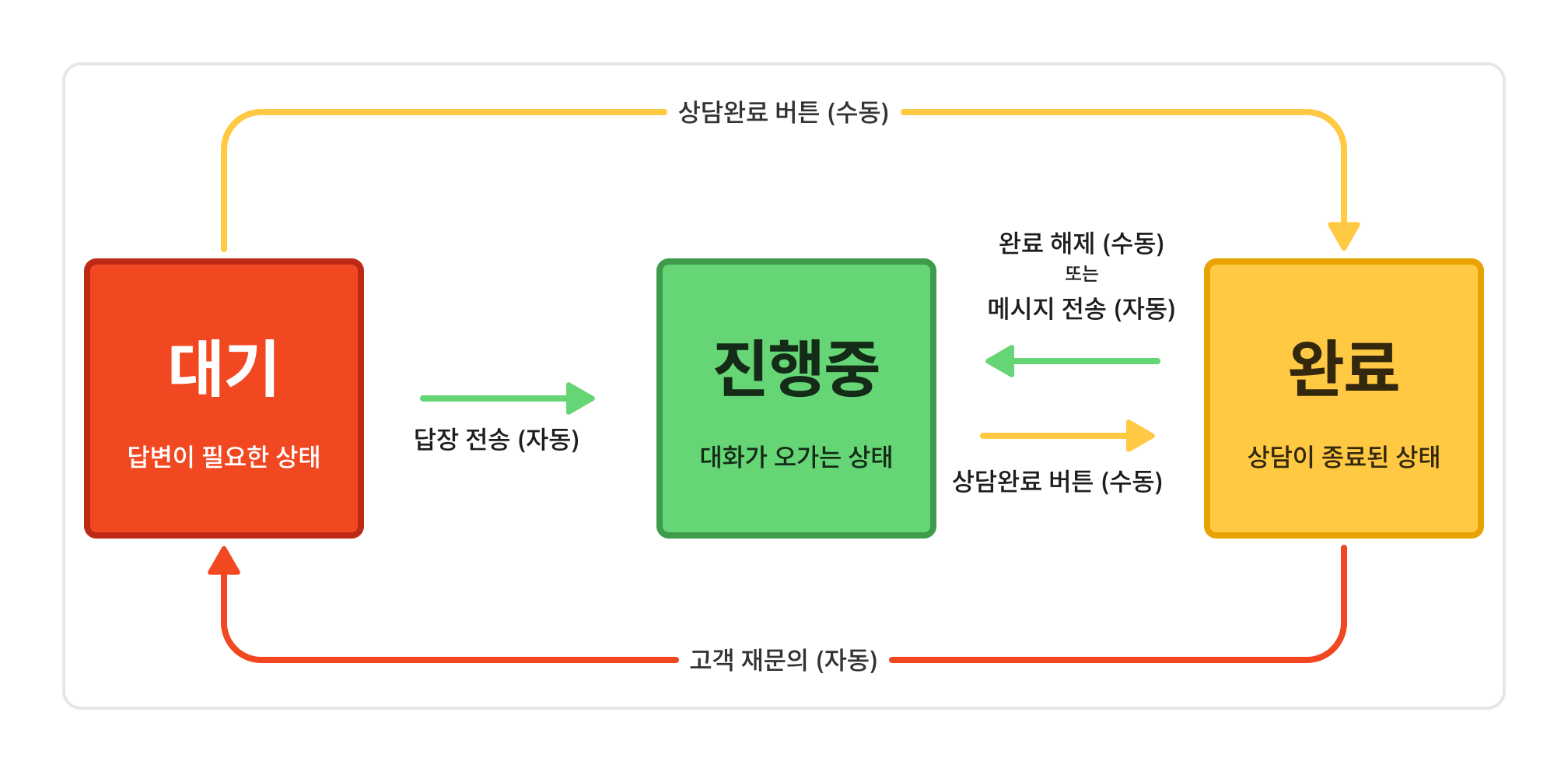 수많은 문의 속에서 '지금 당장 내가 답변해야 하는 방(대기)', '대화가 오가고 있는 방(진행중)', '안내가 끝나서 신경 쓰지 않아도 되는 방(완료)'을 한눈에 구분하여 우선순위대로 빠르게 업무를 처리하실 수 있도록 돕는 신호등 역할을 합니다.