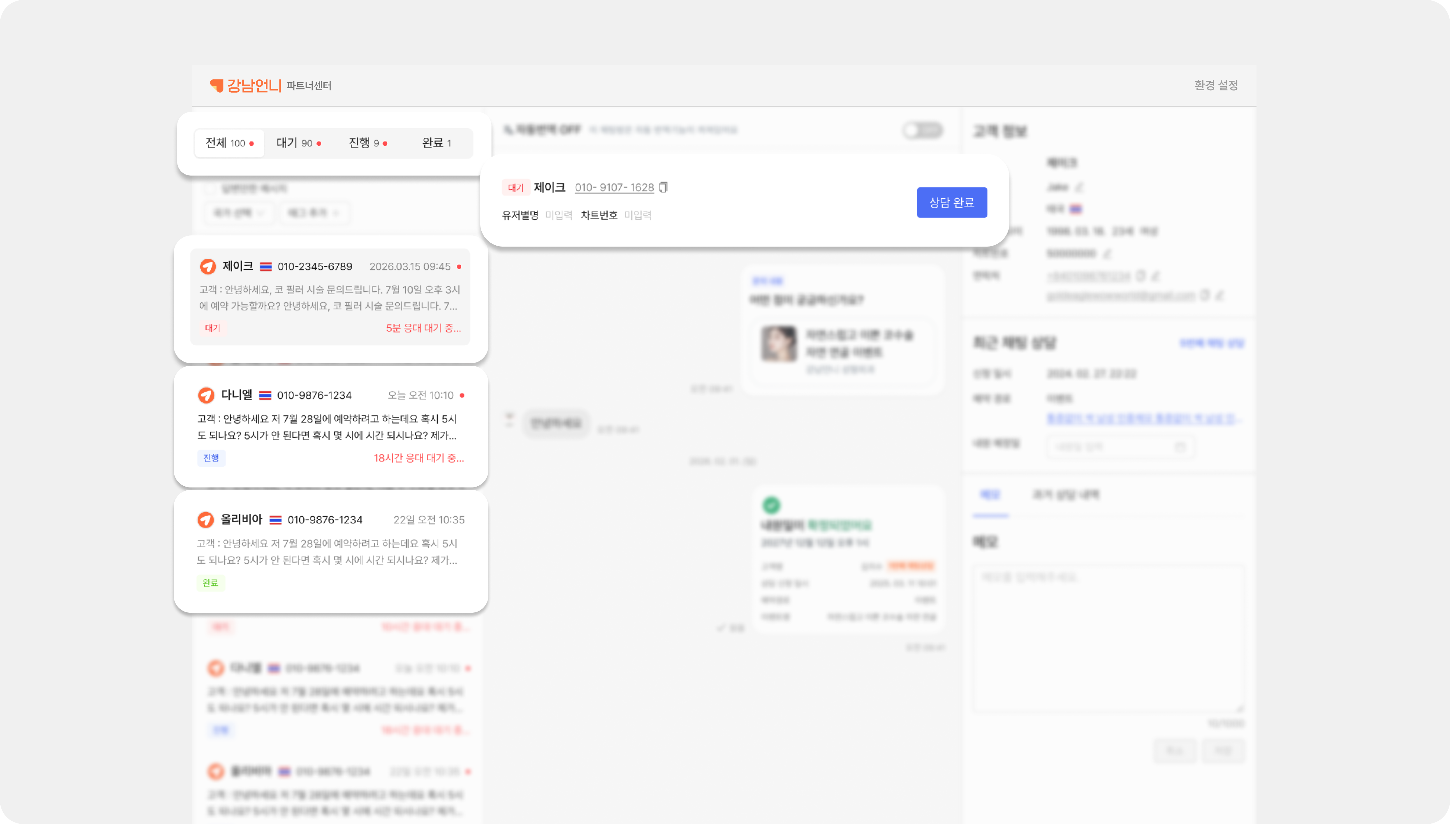 완료된 방이라도 고객이 새로운 메시지를 보내거나 다시 상담을 신청하는 순간, 자동으로 다시 ' 대기' 상태로 튀어 올라옵니다. 새로운 알림과 함께 미답변 상태로 표시되니 절대 문의를 놓칠 일이 없습니다. 안심하고 '상담 완료' 버튼을 적극 활용해 보세요.
