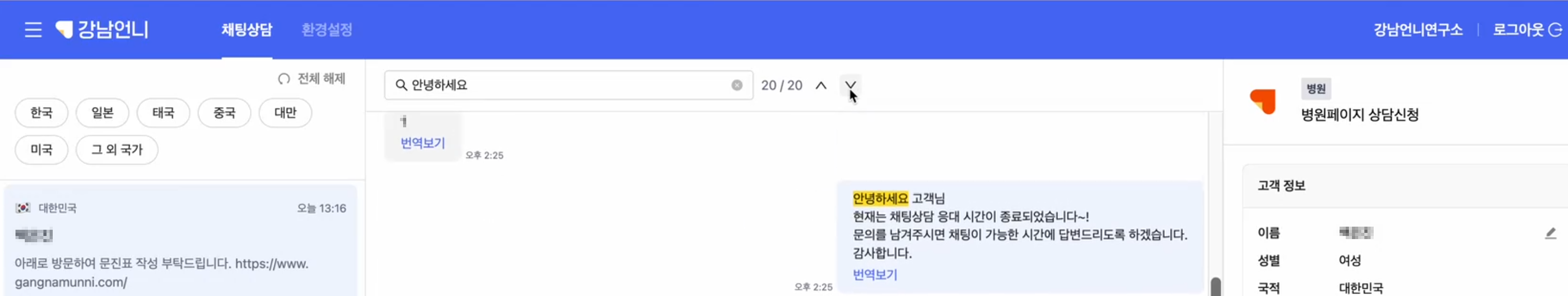 병원에서 강남언니 고객과의 채팅 상담 중✔ 이전 대화 히스토리를 찾기 어렵고✔ 대화 맥락을 이어가기 힘들다는 의견이 지속적으로 접수되었어요.
