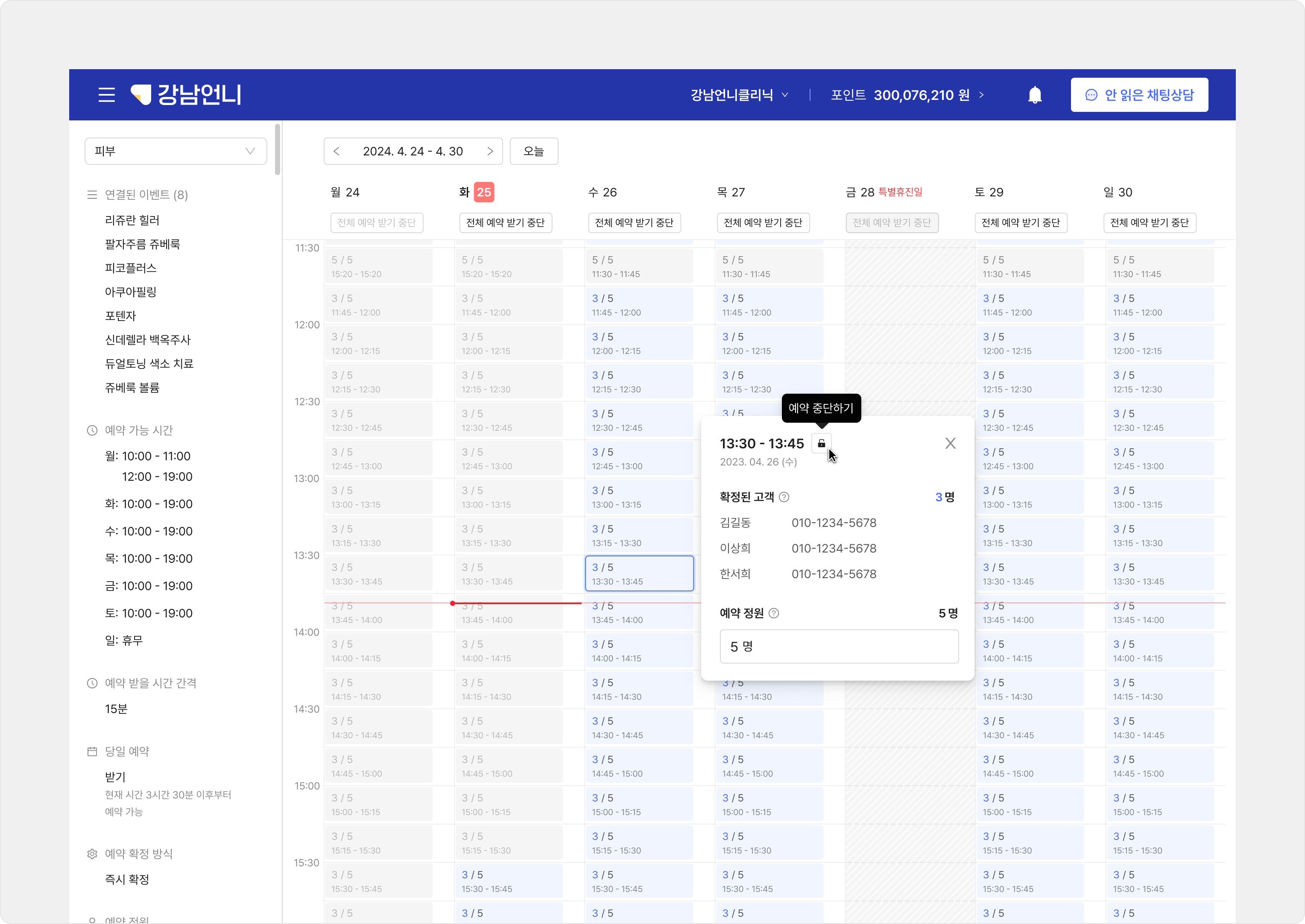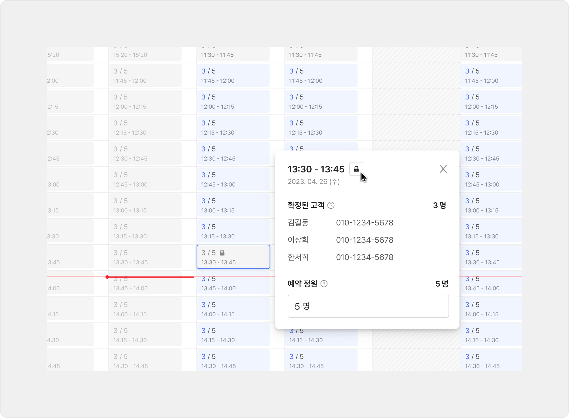 🔒잠금 아이콘을 클릭하면 그 시간대에는 더 이상 예약을 받지 않아요.