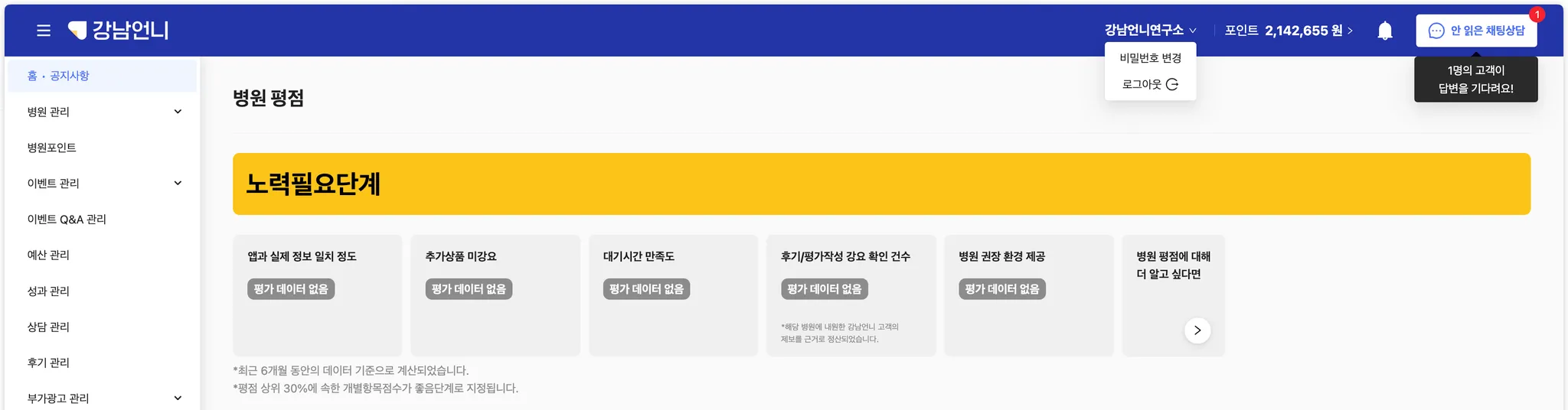 오른쪽 상단의 병원명을 클릭한 다음 ‘비밀번호 변경’을 클릭합니다.