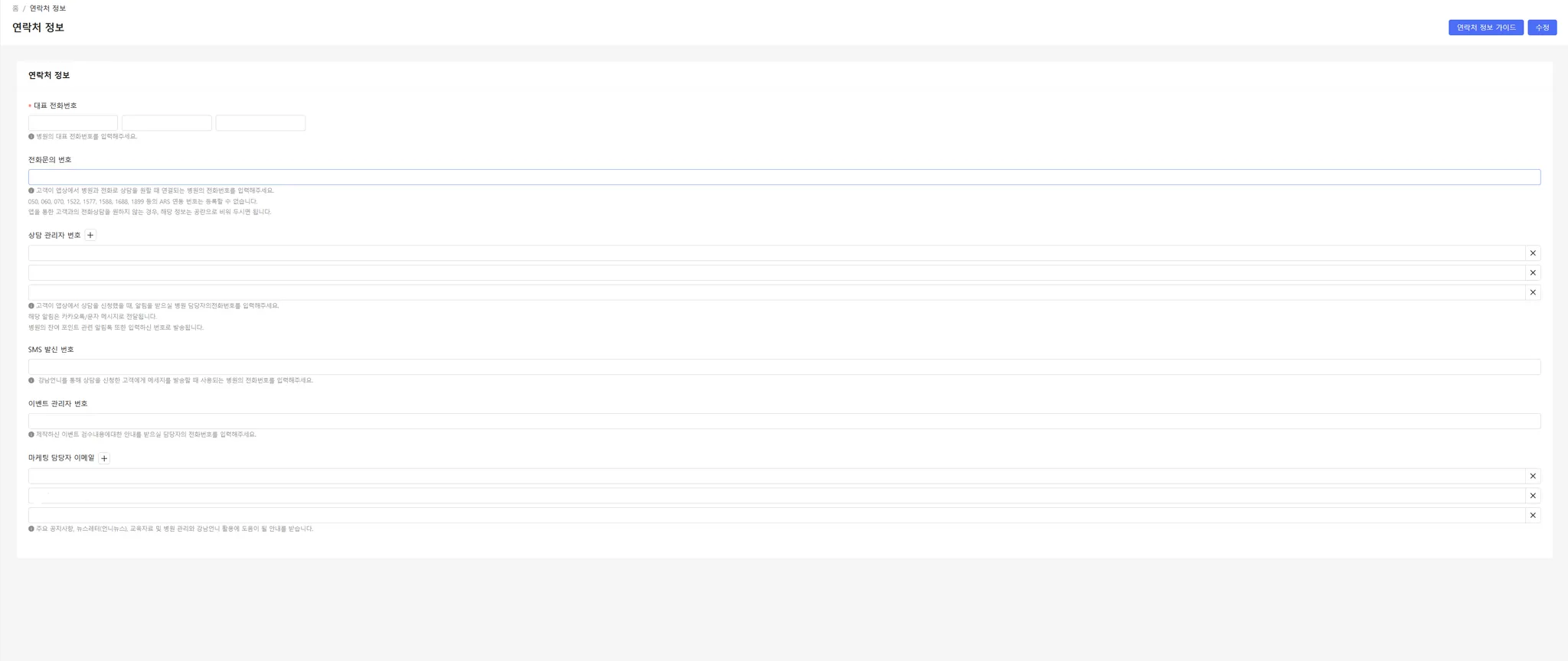마케팅 담당자 이메일 : 주요 공지사항 또는 강남언니 활용에 도움이 될 안내를 받을 담당자의 전화번호를 입력합니다.