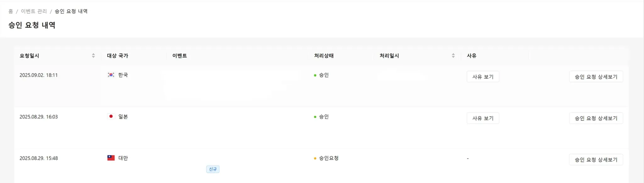 대상국가 : 이벤트가 승인 처리된 후 노출되는 국가를 확인할 수 있습니다.