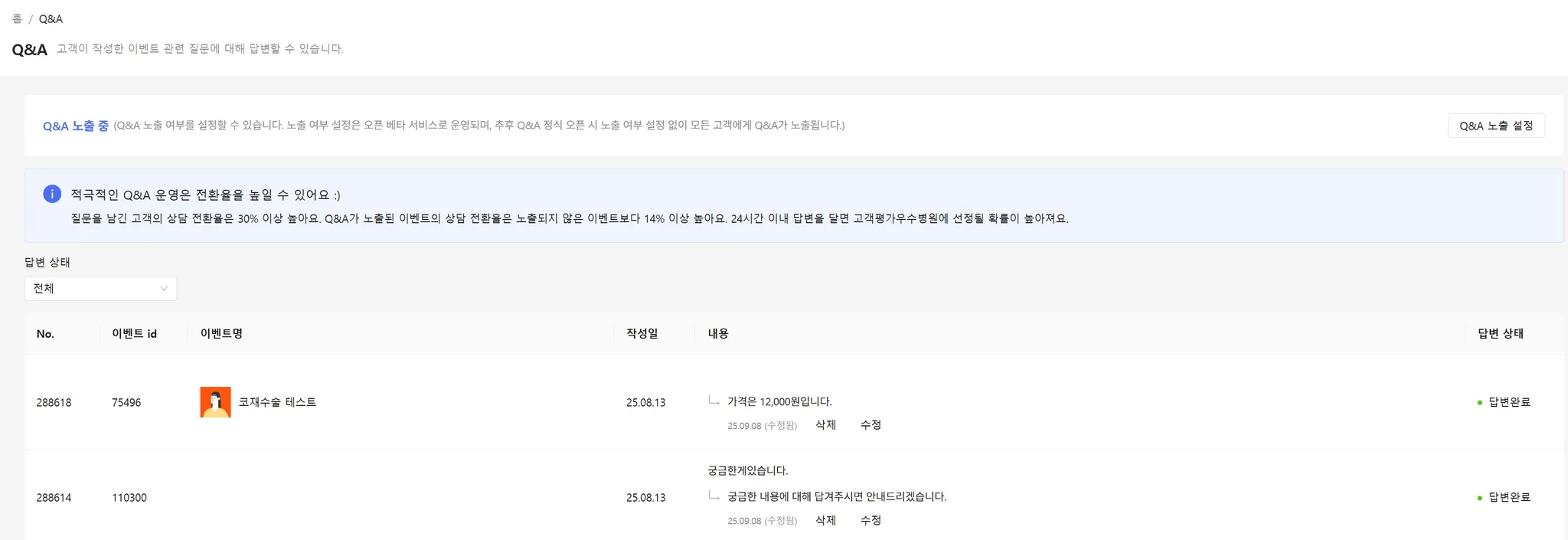 이벤트 Q&A 관리 탭 들어갔을 때 보이는 화면