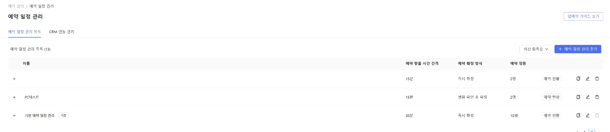 예약관리 탭 들어갔을 때 보이는 화면