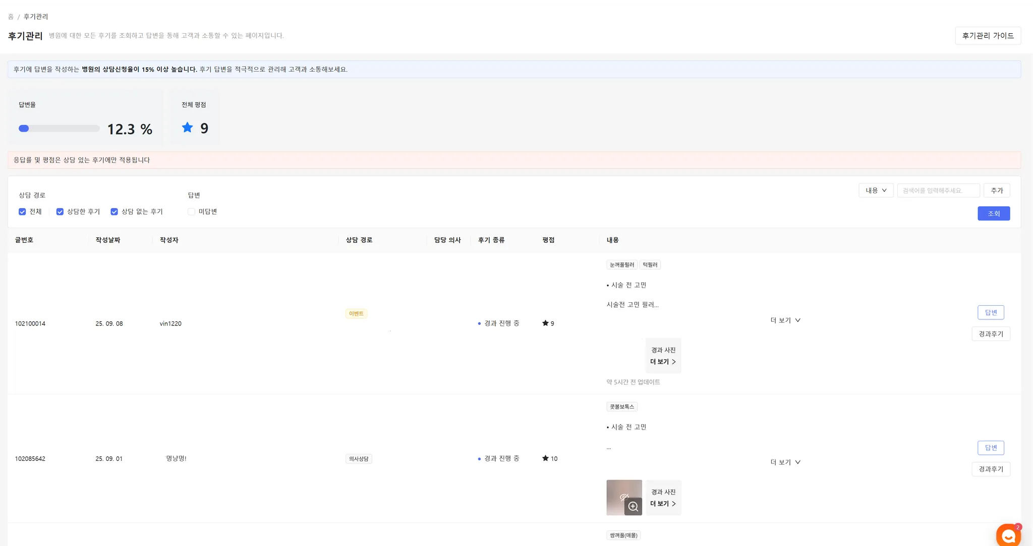 총 경과 후기 개수: 작성된 경과 후기 개수를 확인할 수 있습니다.