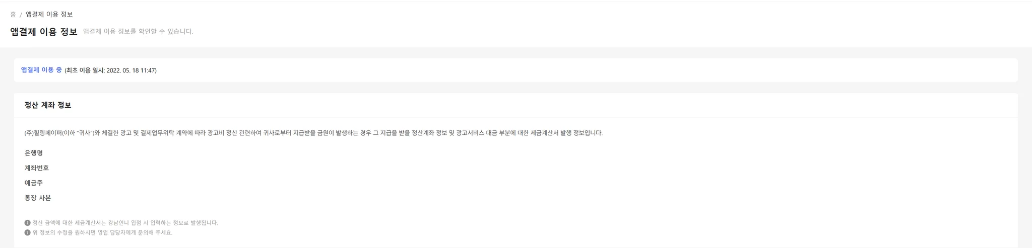 본원에서 이용중인 앱결제 최초 이용 실시 및 정산 계좌 정보를 확인할 수 있습니다.
