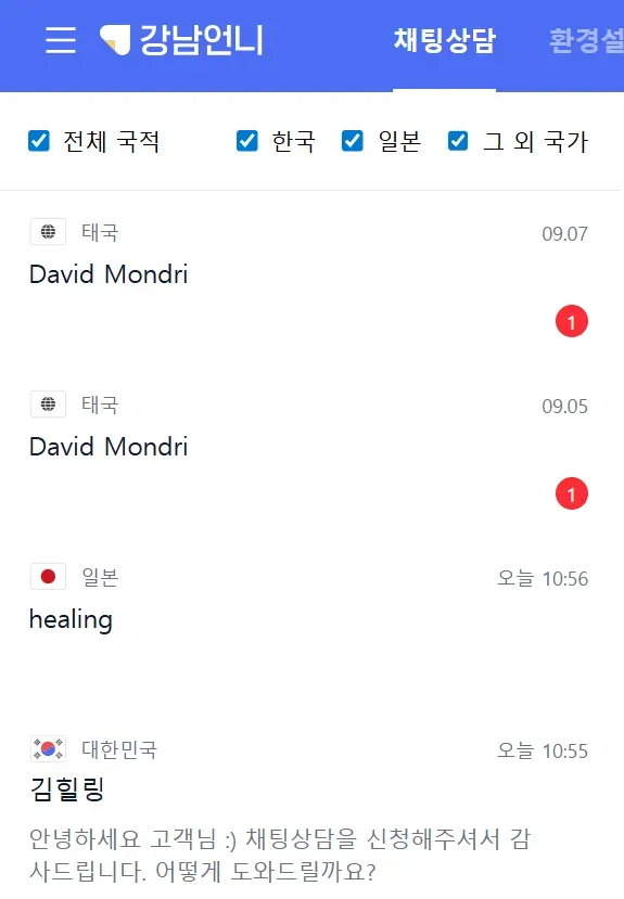 전체 고객 국적 : 한국/일본/그 외 국가/전체 고객 국적 중 원하는 값을 선택하여 채팅 내역을 확인할 수 있습니다.