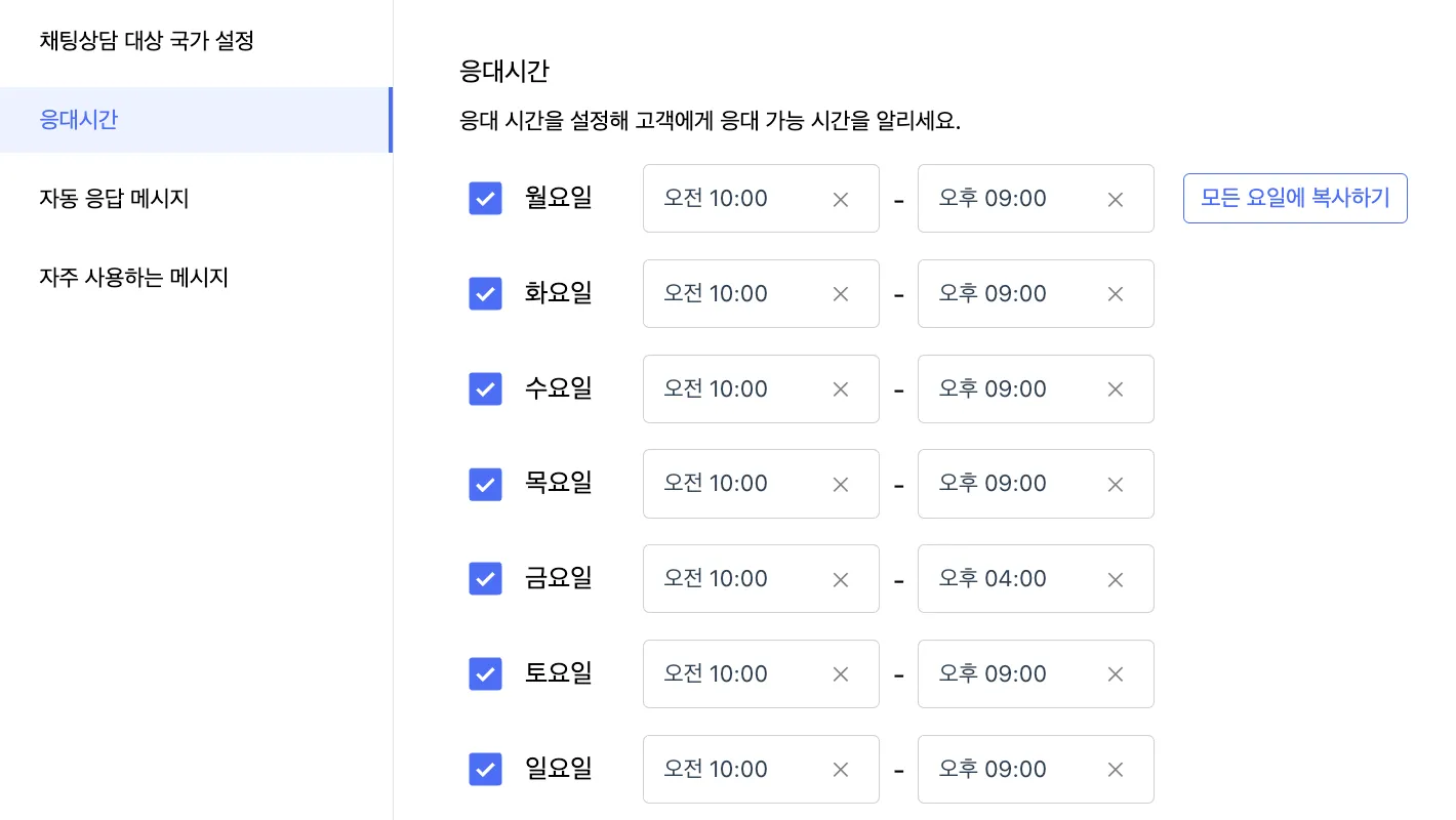 응대시간 : 채팅상담 응대 가능한 시간을 설정합니다.