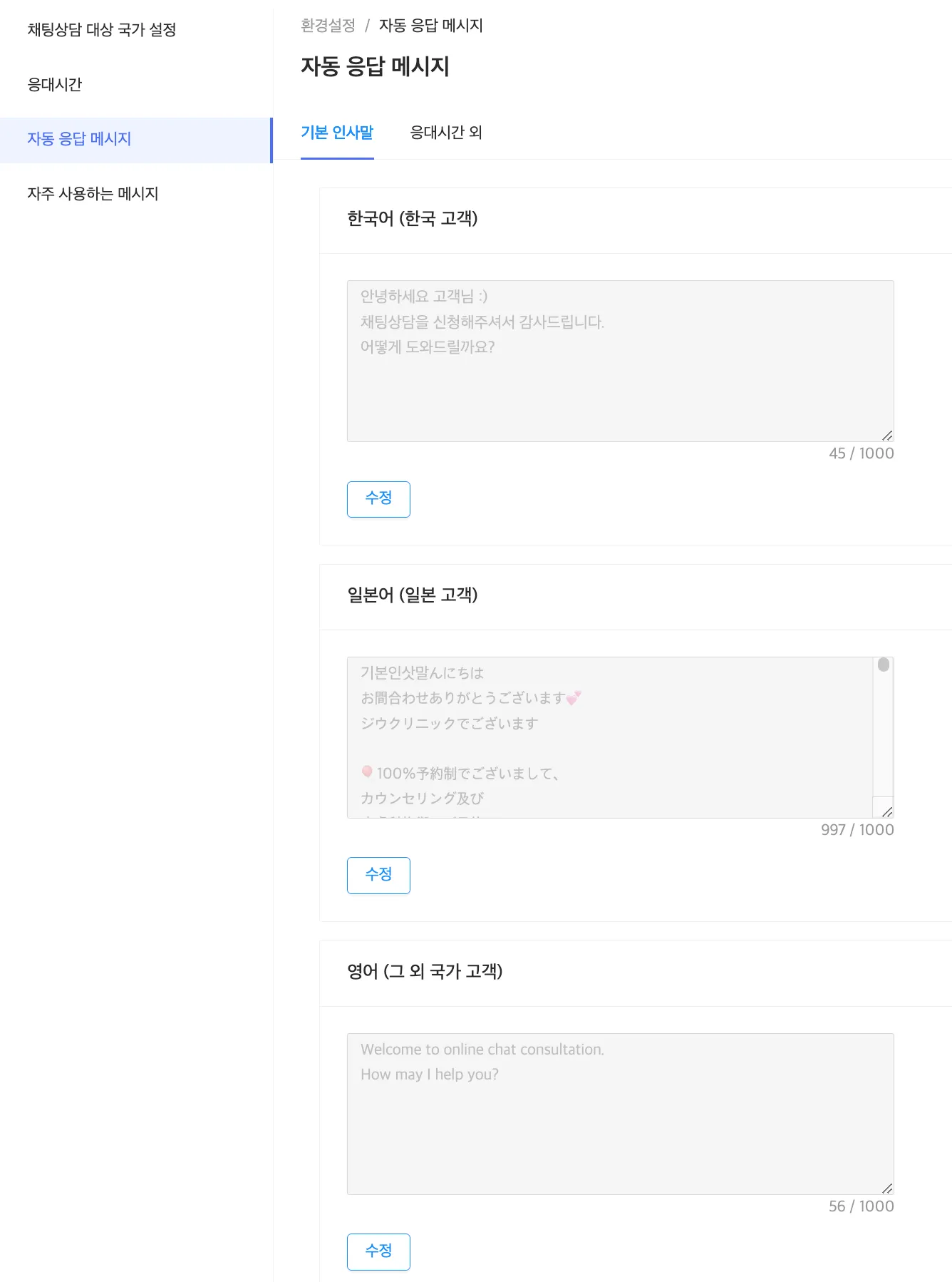 자동 응답 메시지 : 기본 인사말과 응대시간 외 자동 응답 메시지를 한국어/일본/영어로 설정할 수 있습니다.